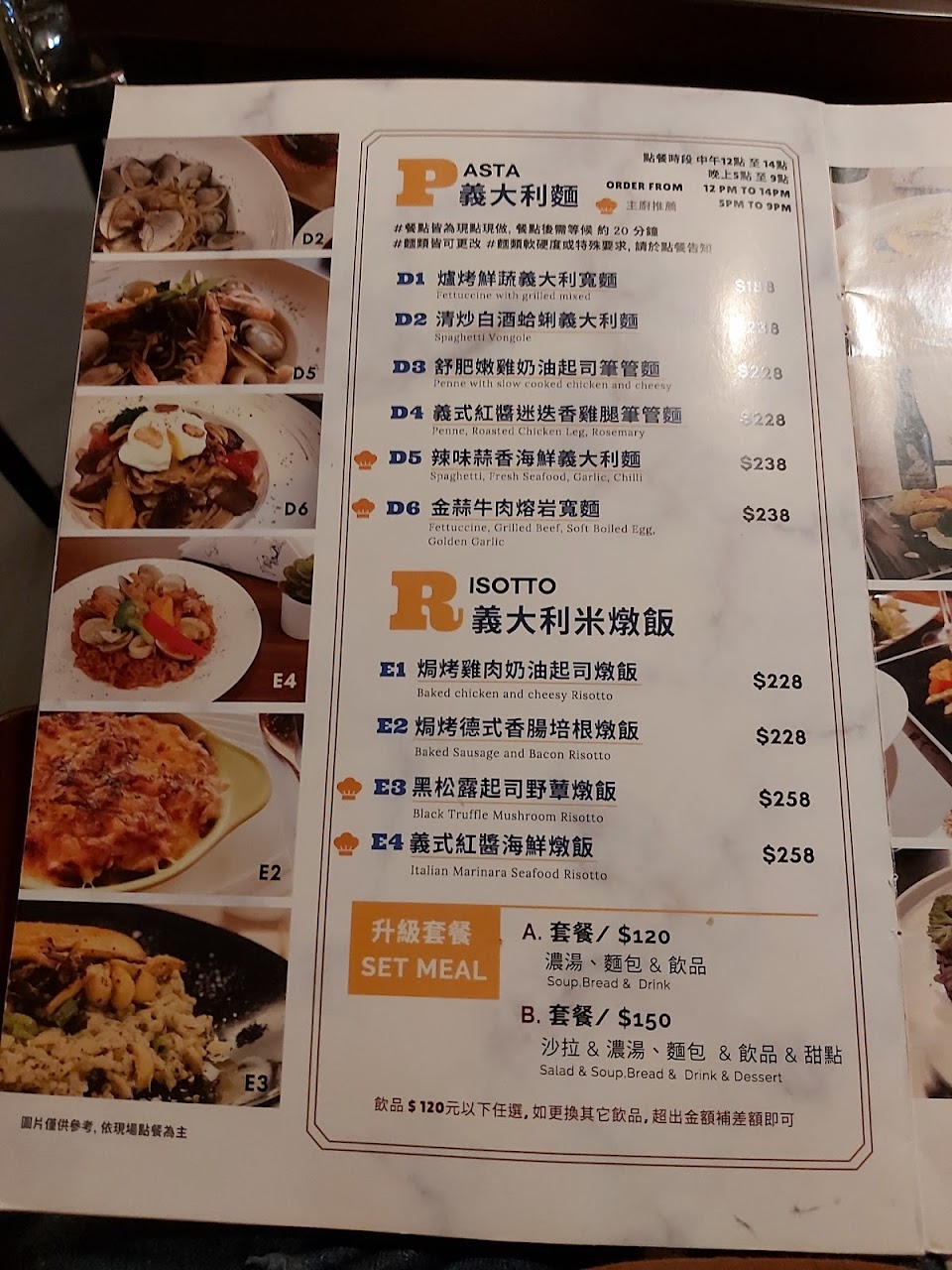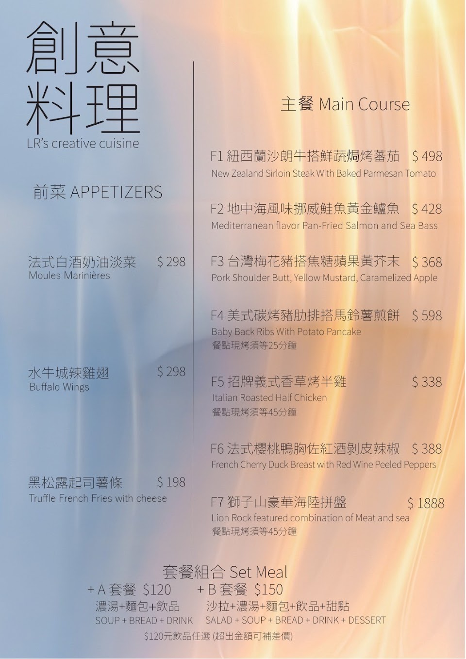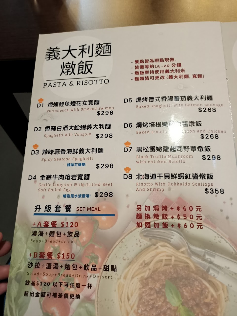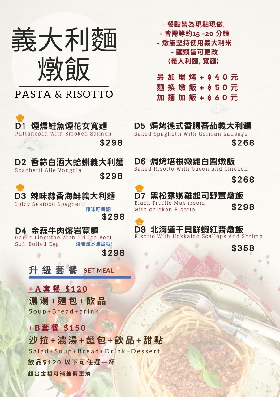 搭配套餐加價$150(沙拉、濃湯、麵包、飲品、甜點)