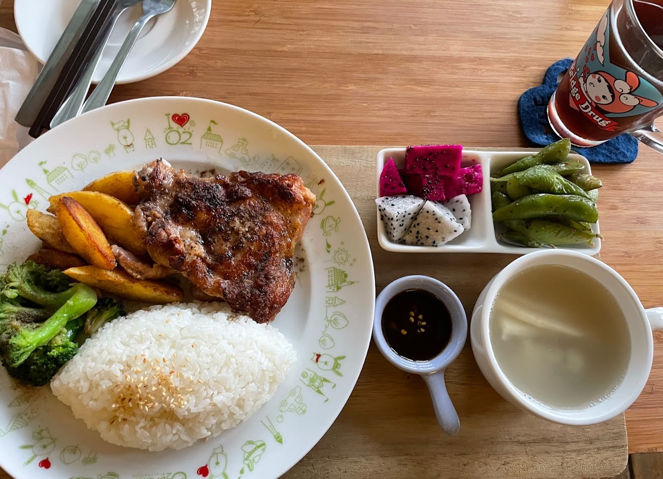 燉飯很濕潤很夠味(不會太鹹!),雞肉也很嫩,蠻多塊的~玉米濃湯也很好喝,裡面有兩小塊麵包,但我還是忍不住把另外兩塊麵包沾著吃,真的很搭~沙拉也很豐富,除了生菜以外還有各種水果,沙拉醬也很清爽~水果茶真的也給很多水果,印象中有蘋果、芭樂和柳橙,而且很大杯!