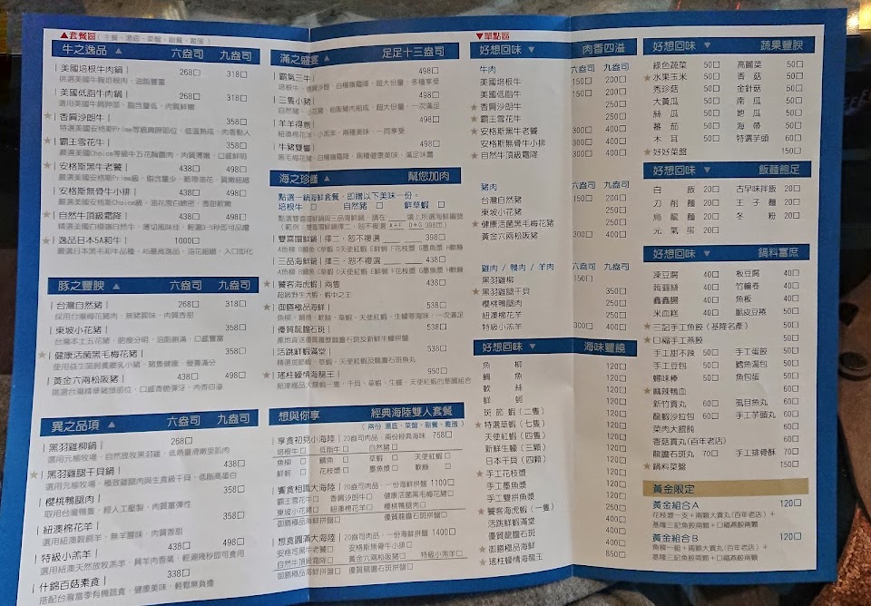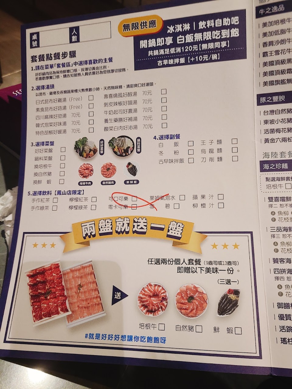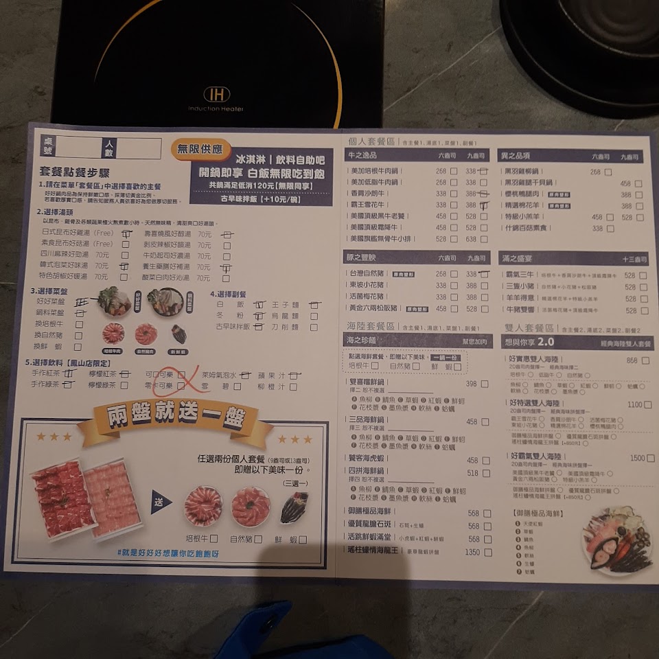 ?特色:點兩份9oz以上的套餐會再加送一份6oz的肉~白飯吃到飽~菜盤可以菜多或火鍋料多、也可換肉或蝦~