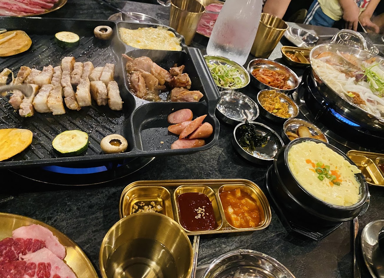 東西不是很好吃 上餐速度慢 價錢偏高 不是很推薦 走道位置很窄 音樂有點大聲可能跟對面的講話都要用吼的 對了 那個首爾奶茶是立頓奶茶喔 請不要花68塊來喝喔 還有那個水波蛋整個燒焦味! 然後三層肉都是油 服務人員幫忙烤肉服務態度親切 不過那個油可以不要一直噴到人嗎?很痛!