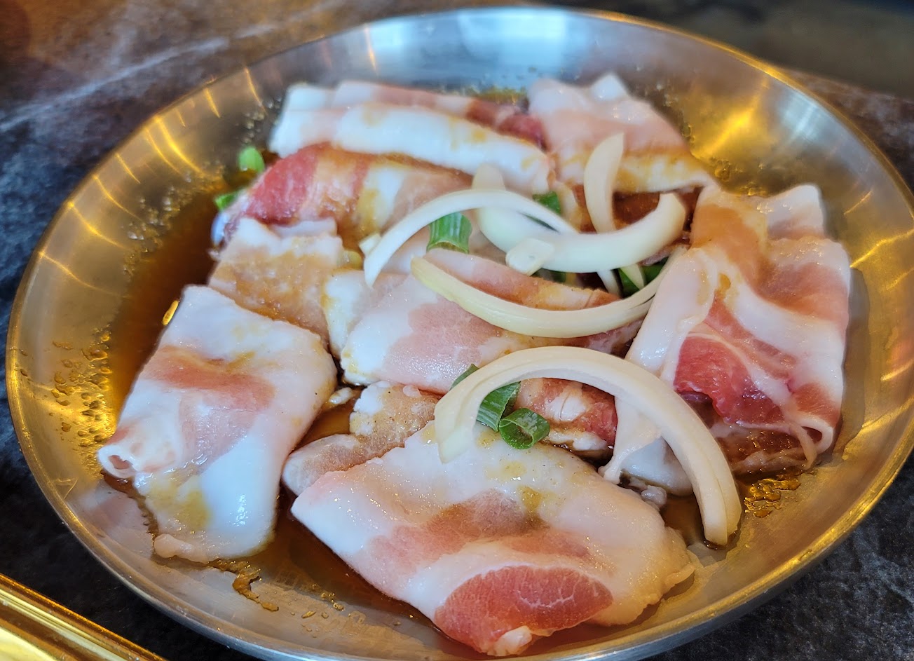 套餐內容: #三層豬—三層豬有帶肥肉, 肥肉部位挺大塊, 所以很油, 不愛肥肉的人就…略過, 很大塊, 有給剪刀, 這是沒有調味的, 烤好之後剪成小塊, 建議搭配沾醬/配飯/生菜一起吃!才不會太肥膩 #松阪豬—很有嚼勁, 可以沾醬, 包生菜, 單吃 #韓醬五花豬 #配菜—挺多種, 量都少少的, 搭配著吃, 有生菜/焗烤玉米/德式香腸/蘑菇/杏鮑菇/地瓜…..等 #原味海苔手抓飯—-送來只看到滿滿的海苔絲, 下面才是飯, 給手套, 用手抓成海苔飯糰, 這道很適合搭配烤肉 #韓式水蒸蛋—上層還不錯, 中下層很濃的蛋被煮焦了的味道, 失敗…. #泡菜嫩豆腐湯—料很多, 豆腐很大很多塊, 還有肉/金針菇/香菇/蛤蜊/泡菜/洋蔥…調味較重, 有點辣, 不要喝太快避免嗆到 #小菜六種—韓式泡菜/黃豆芽/海帶/洋蔥/白蘿蔔/油淋蔥絲 #甜點—給兩個代幣換冰淇淋, 很像麥當勞的冰淇淋, 很甜, 味道普普