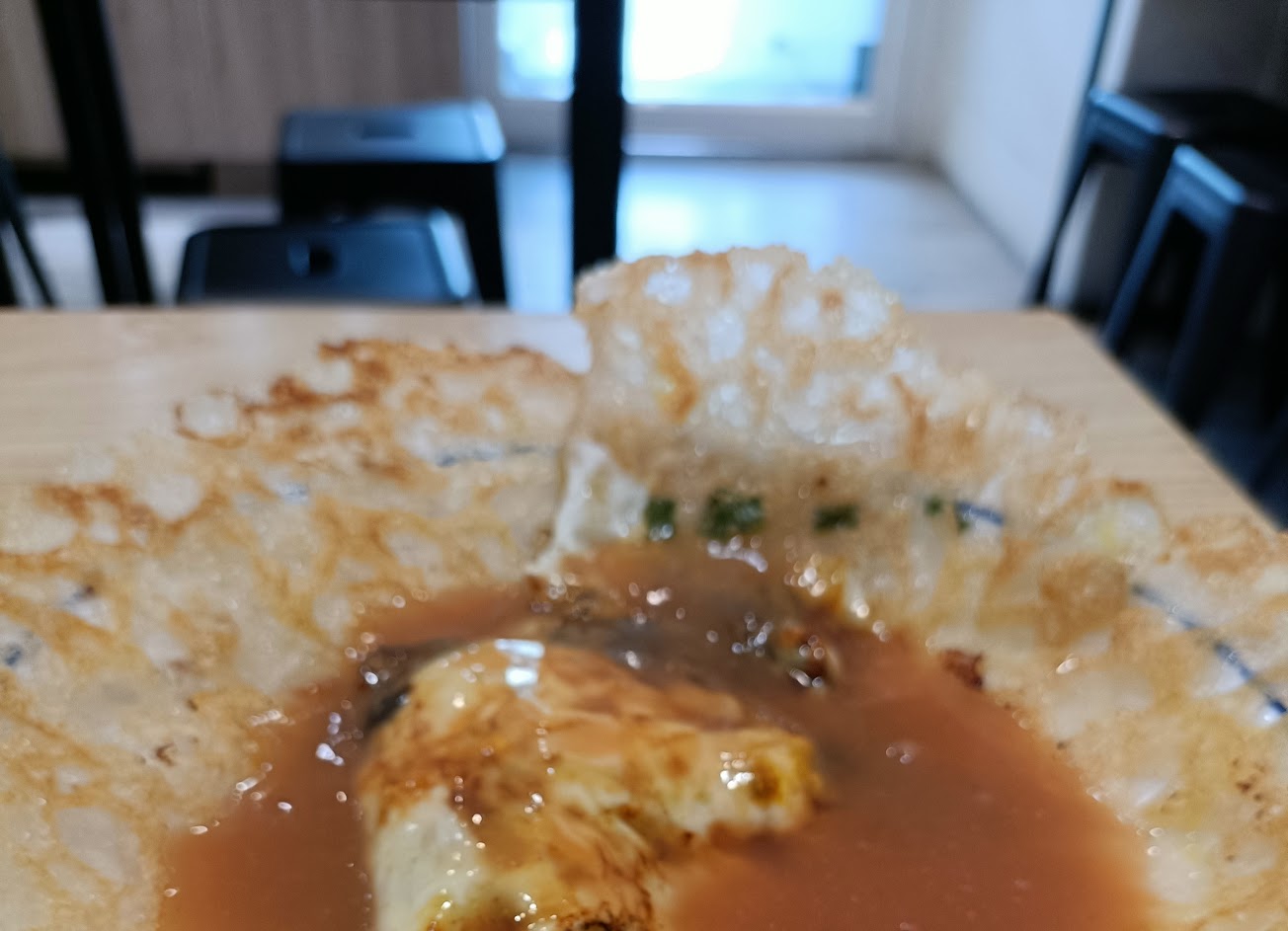 粉漿皮煎成咔哩咔哩的外皮~滿滿的餡料裡面挖開還有像驚喜包的意麵 😋