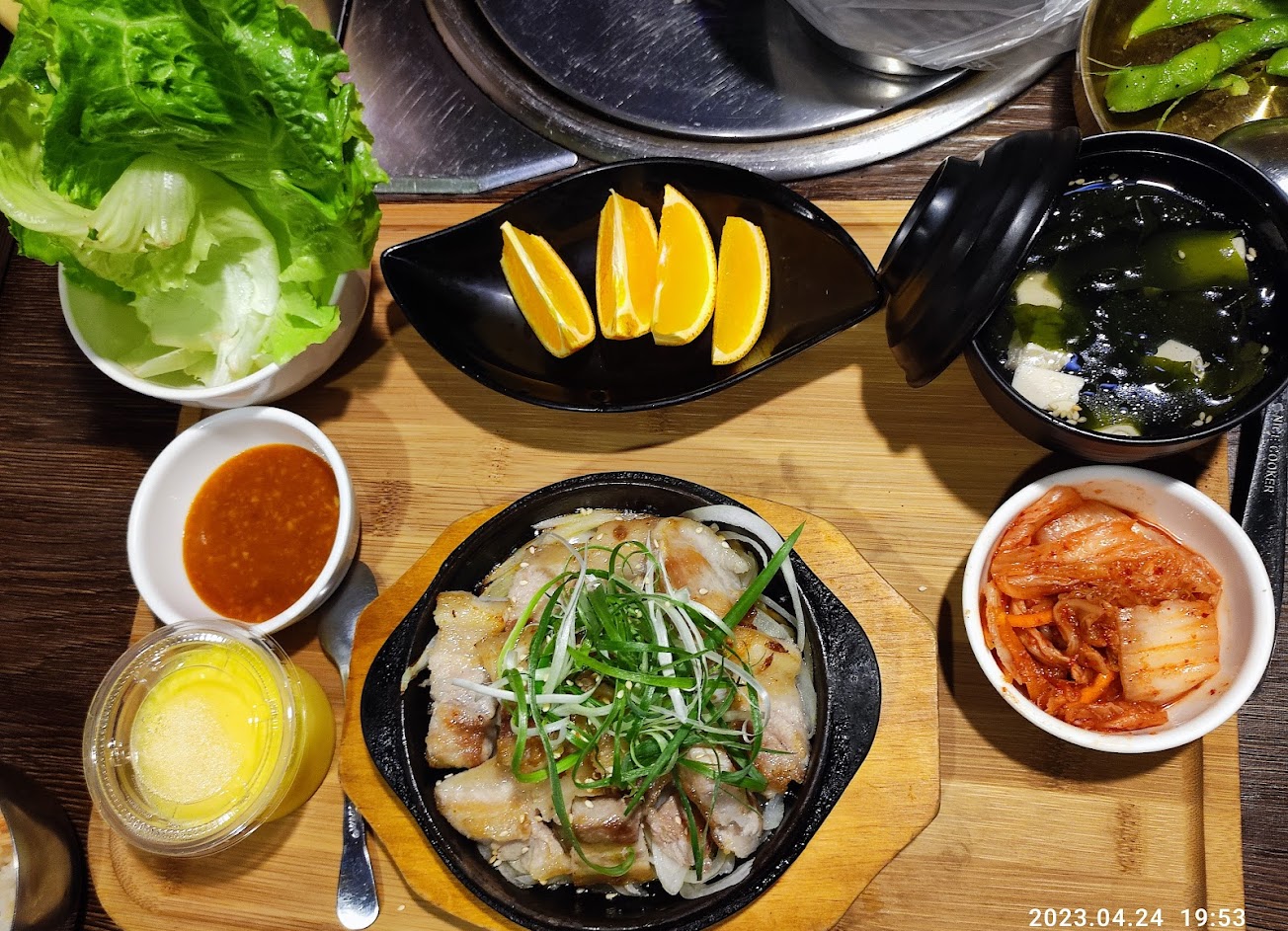 點了單人牛豬雙拼500塊吃到一條裡面幾乎整條都是油的普通豬肉,牛肉片可以說是沒有任何口感可言。海鮮煎餅就像是一塊披薩麵包。唯一能吃的竟然是洋蔥圈。