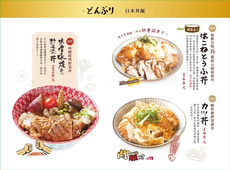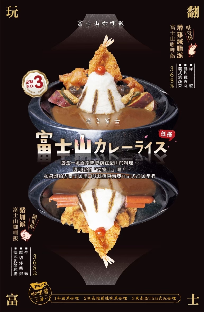 起司瀑布嘩啦嘩啦雞咖哩飯, 火山爆發咖哩飯, 主廚私房炒野菜, 厚切豬排咖哩飯