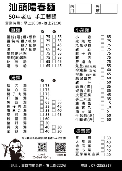 因為一個人來高雄旅行,沒辦法嘗試汕頭火鍋,只好來吃吃陽春麵,雖然吃完還是對汕頭口味矇矇懂懂??可是還行啦,還不錯吃,那個麵偏細蠻特別,說不出超好吃但很順口,默默就想把它吃完,至於魚肚更特別,也是第一次吃,完全是我的菜!店員也都親切有問必答,休息吃飯都站著吃又要顧麵,辛苦你們了! …