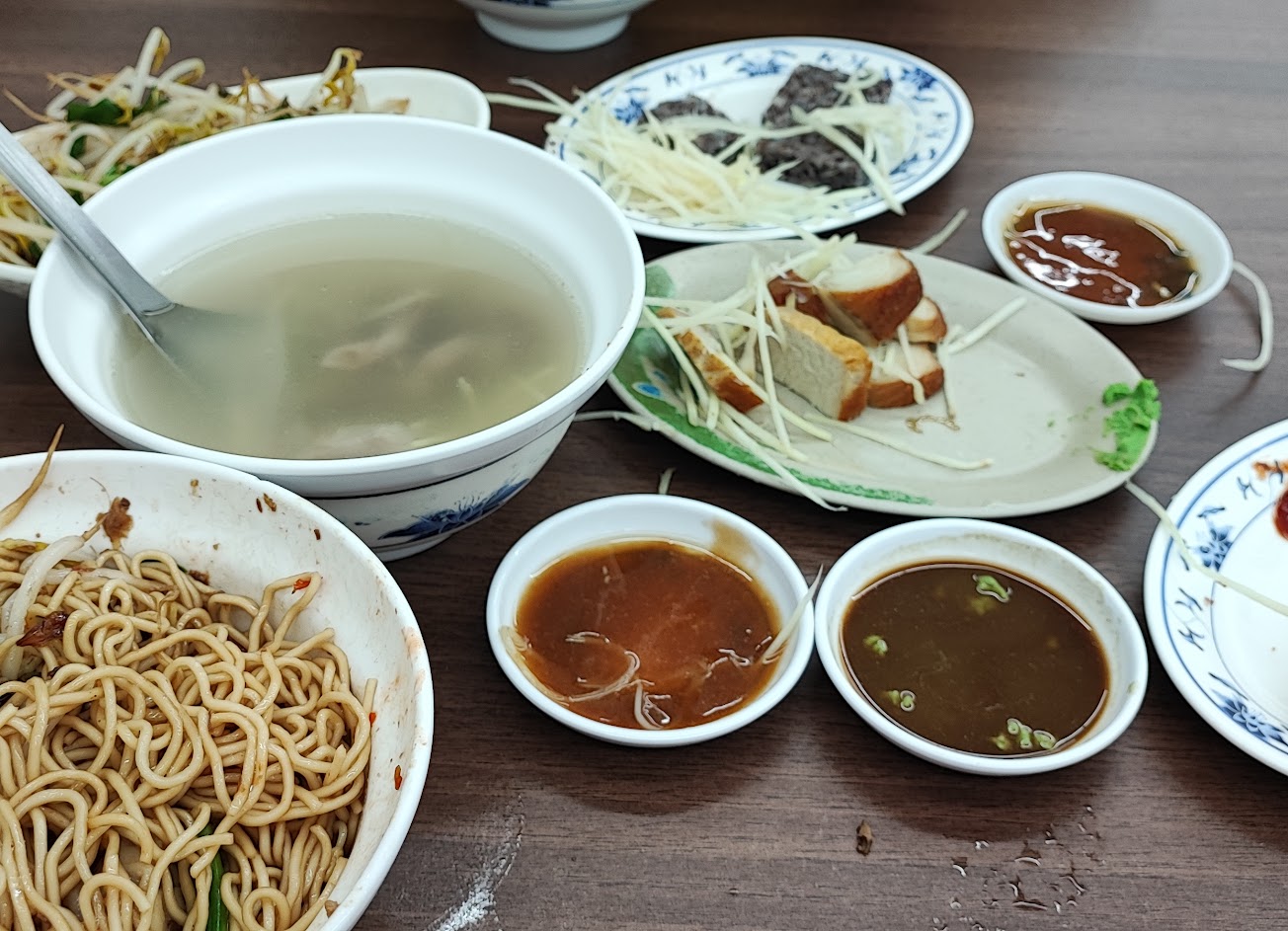 搬離林森路後第一次買,味道變了,以前外帶乾麵都還有滿滿油蔥酥的香味,今天外帶回家後變肉燥拌麵,不用拌每根麵條就都是醬油色,口味偏鹹。大碗的骨仔肉湯肉很多,推魚蛋沙拉,經典招牌菜。