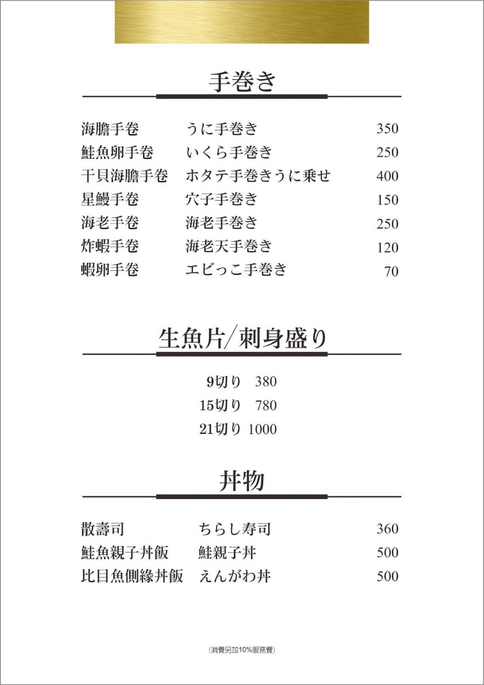 9/13星期二去,全場空的只有我們兩人,說到貨日是星期三所以要點什麼生魚片都沒貨,吧檯師傅自顧自的就說要自己配壽司給我們也沒說是什麼食材,我們立刻拒絕,生魚片只好讓師傅自己配,端出來也是鮪魚、透抽、旗魚、、、連鮭魚都沒有總共不超過10片,然後還是凍太久魚肉已經出現毛邊狀的現象,烤出來的雞肉上桌還沒吃光是廚房切塊就解體不成塊狀,當下立刻取消未上桌的餐點,結果生魚片要價2690、烤雞串360!!加上其它已上桌的小點共計4719元,耗時不到半小時離開!!我這才明白為什麼都沒客人!!!!久久消費此店一次已行之多年,但此回是最驚嚇我的一次,再也不會回頭此店!!!多年前的好口碑完全不復存在。