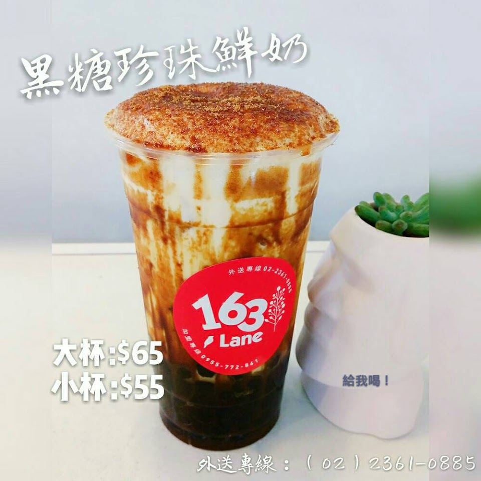 吃完豬腳,特別想喝點甜甜的飲品。今天來到【163 Lane】,看一下菜單,沒一般的珍奶?? 跟店家指名要黑糖珍珠奶茶,價格還挺親民的。看到店家還很認真的手搖,品質應當不錯。