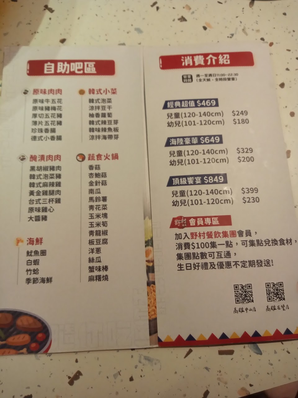 前身是野村燒烤,所以評論裡很多品項是沒有的,可以刷卡及發票載具,CP值不高,不難吃但若要吃牛肉及海鮮(天使紅蝦、蛤蜊、干貝)需另外加價,且線上點餐送餐慢,以身高衡量小孩價格比較不友善