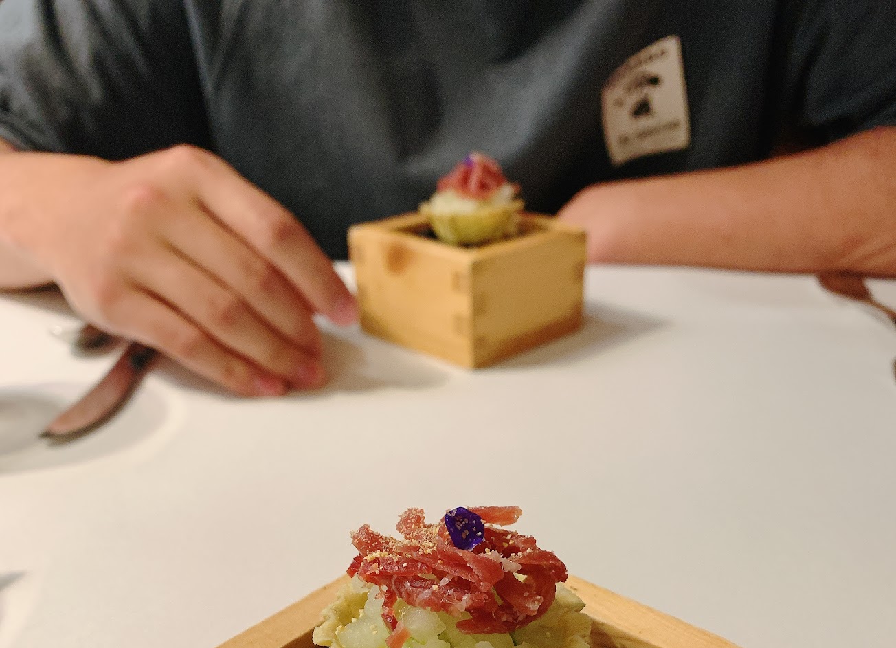 今天吃完感想只有超讚可以形容 服務真的很棒 還會敘述每一道料理的故事 這次主要也是慶生+週年紀念 下次一定會再回訪的? 1.開胃菜 底部海藻製成的酥餅 搭上胭脂蝦刺身及金桔(檸檬?)凍 整個入口的感覺層次變化非常厲害! 從一開始的海藻餅味到酸甜的香檸味 最後尾韻是胭脂蝦的甜與鮮 2.開胃小菜 白蘆筍配上鮭魚卵 這道比較屬於清淡的風味,但比較建議這道放在第一道由淡帶入深會比較有感覺? 3.冷前菜 天使冷麵配上東石蚵仔與佐料 擠上金桔之後整體風味都大大提升不少 番茄超甜,蚵仔超鮮,三種組合起來真的只有完美可以形容 4.熱前菜 小卷、火龍果花、秋葵、水果甜椒、杏鮑菇 底部醬汁為紫心地瓜磨成泥,很甜! 還有提供自製鬼椒與朝天椒的辣油,超過癮 整體搭配起來很好吃,加上辣油簡直完美 5.小缽 赤嘴仔海鮮蒸蛋 以赤嘴仔為主軸搭上生食級櫻花蝦與胡椒葉 入口第一句就是 乾,也太鮮了吧! 真的滿口海鮮味在嘴中爆開來 野生赤嘴仔很鮮甜好吃? 6.主餐 味增梅花豬佐酒杯菇玉米筍 以味增下去醃漬48小時,再以胡桃木(? 煙燻、烤出香味 這道真的讓我無法忘懷 第一次吃到這麼好吃的豬肉 非常嫩、非常香,每一口都讓人很滿足 為了這道我願意再回來吃? 7.副餐 碳烤豬肋排+薯條 豬肋排非常軟嫩,一刀切下去就化開 但可能是前一道太強,這道就沒有很驚豔 薯條很脆很爽口,搭配一口酒真的讚 8.甜點 千層派佐千層酥 上頭是靜岡抹茶、竹炭、鮮奶油製成 搭上季節火龍果、牛奶水蜜桃、梨子 千層酥應該是百香果風味,酸酸甜甜的 外觀就像一本書一樣,代表者這一年來 經過了許多風風雨雨的故事 兩者搭配起來能吃出店家的用心 9.季節調酒 無酒精&有酒精可選擇 我們是選擇各1杯 因為我本身不喝酒 淡淡的薄荷香氣讓人一口接著一口 10.餐前酒 法國無酒精白葡萄酒 聞起來有濃濃的酒香,喝起來很順口 不會像外頭無酒精的像果汁一樣 服務 內用 餐點類型 晚餐 平均每人消費金額 超過 $2,000