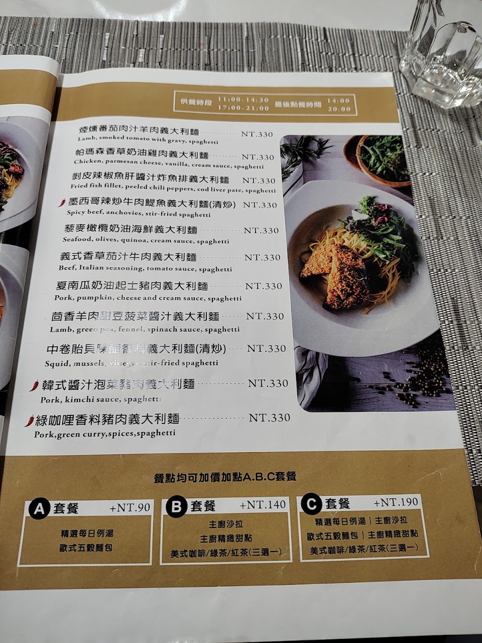 餐點口味有點….太特別 今天點了茄汁橄欖海鮮麵和鹹蛋小卷燉飯 茄汁口味很奇怪,裡面有一種像梅干的東西 !?海鮮的腥味很重 燉飯口感像寶寶粥,感覺很台式 副餐從沙拉、甜點到紅茶沒有一個覺得很不錯的….需要改進的感覺很多… 台灣義大利麵餐廳那麼多,第一次遇到那麼雷…?完全吃不下去(但感覺店員也沒有想了解)
