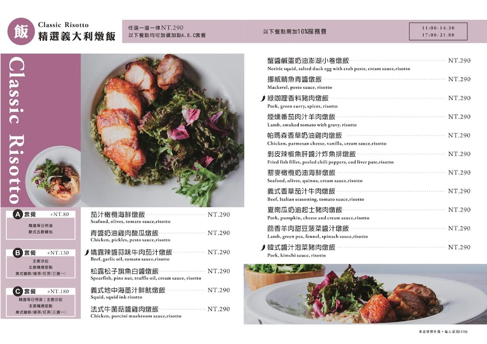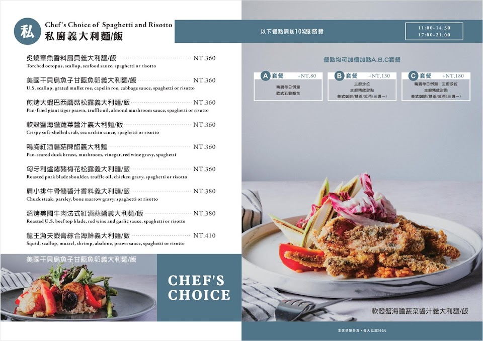 這次點了軟殼蟹海膽蔬菜醬汁義大利飯跟松露松子旗魚白醬義大利麵,加點$190升級完美的套餐,飲料也是加價!