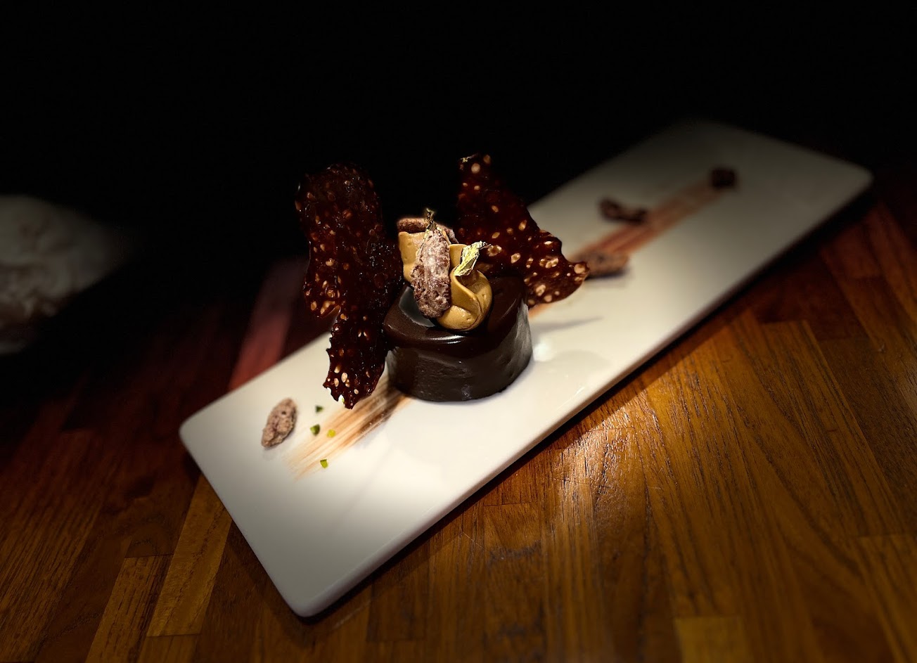?沈醉的大衛 基底:蘭姆酒、柑橘香甜酒、杏桃白蘭地香甜酒等? 半顆檸檬上擺上八角,還有薄薄一層生命之水~??點火讓酒精揮發,也讓視覺效果很加分,再把檸檬壓入杯內飲用,視覺跟味覺都很棒的一杯調酒? – 另外~ 半乾番茄漁獲海鮮麵跟巧克力慕斯蛋糕也很棒,蛋糕推推,是苦甜巧克力,焦糖慕斯蛋糕,淡淡焦糖味蠻好吃的??