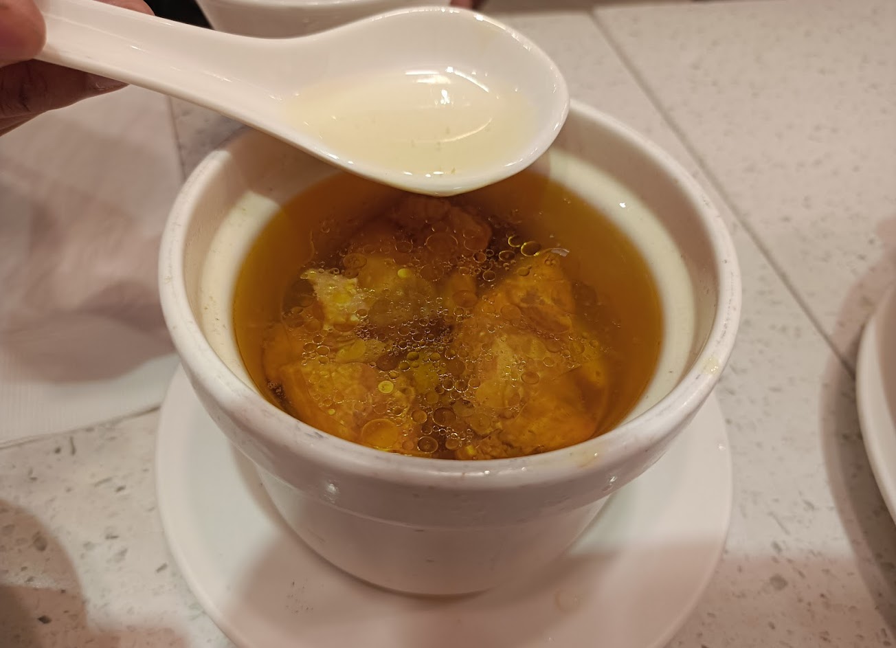 東坡肉 份量蠻多的 搭配麵包吃 很有飽足感 配飯也不錯 飄香排骨 聞起來很香 吃起來有點柴 雞湯 很好喝但是雞肉非常柴 湯包普通 八寶芋泥 不錯吃 沒有到很甜
