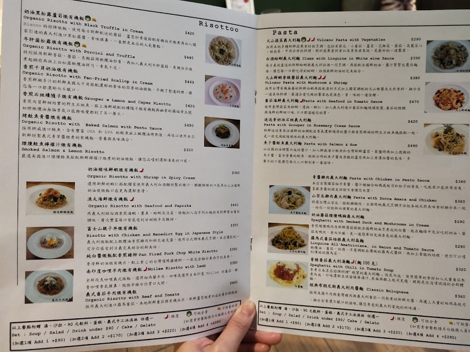1. 晚上7點前往用餐,內場加外場只有2位店員,尚未點餐就先告知餐點要等比較長時間(約30分鐘),三道主菜(披薩/燉飯/義大利麵)依序出菜,結果前菜最後才上。