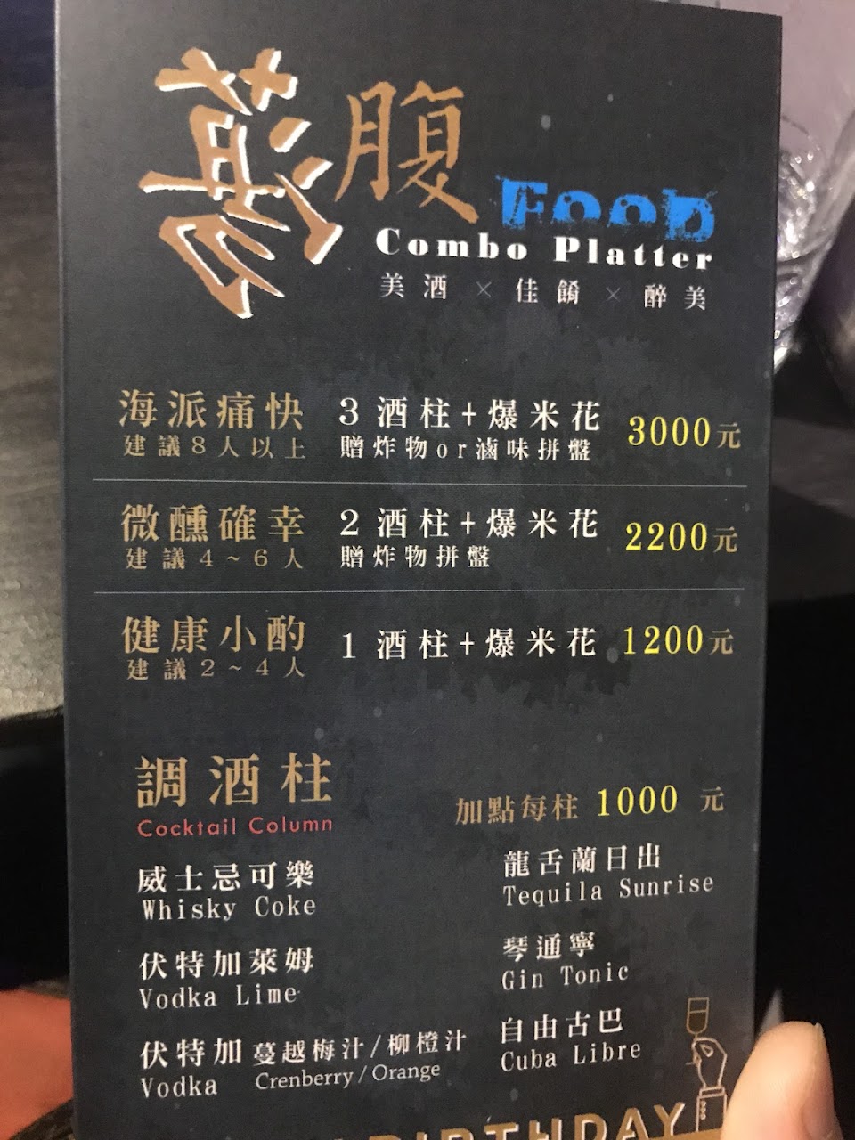 第一次和朋友到高雄的bar, 店員怕我們無聊問我們要不要玩吹牛, 就醬喝了一杯環遊世界和環遊宇宙. 調酒部份好喝, 店員算是可愛弟弟型, 這次來的時候可惜人不多, 也不能唱歌, 所以喝完就走了…
