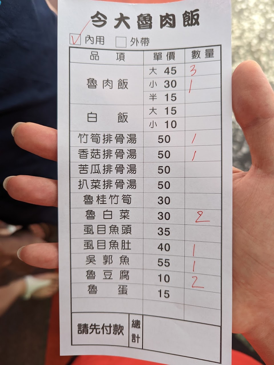 可謂三重最知名魯肉飯,用餐時間必定大排長龍,但翻桌率高,消化速度滿快的,因此實際上並沒有等太久。內用外帶均需排隊,內用點餐完會有人帶位並將餐點端上桌?
