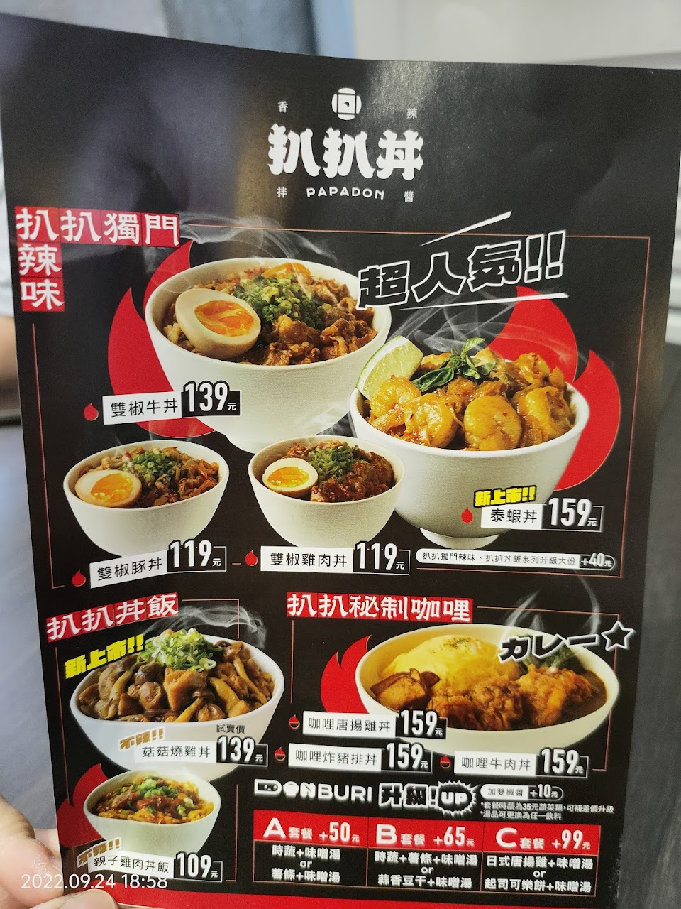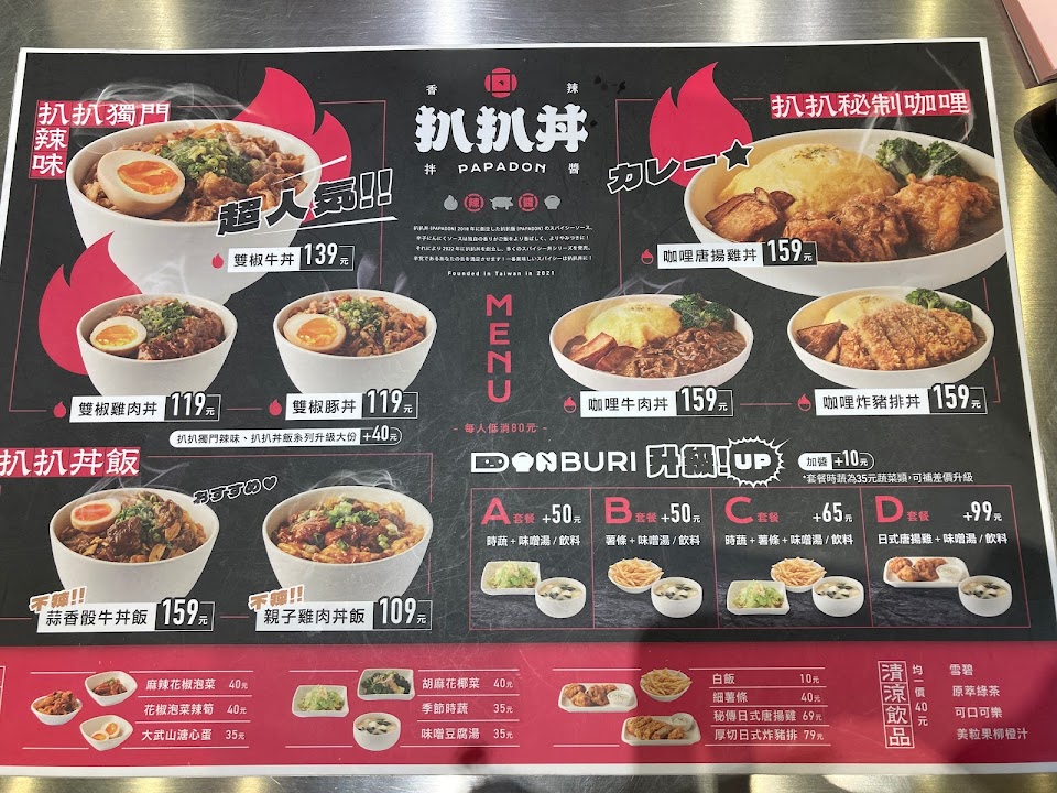 味噌湯, 時蔬, 雙椒雞肉丼, 薯條, 泰蝦丼, 親子雞肉丼飯, 鹽蔥牛肉丼, 雙椒豚丼, 蒜香骰牛丼, 唐揚雞定食