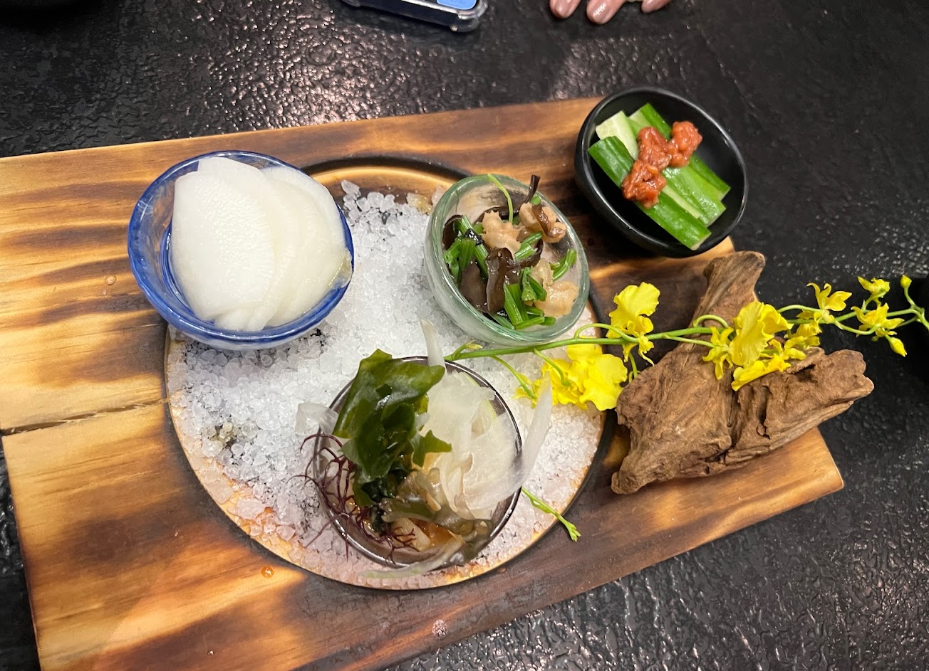 這是我第一用餐,點了一個經典套餐跟極上套餐點完餐後,先上了一份招待的東西(圖4),我真的覺得可以不用,因為不好吃也不知道重點是什麼?海鮮時蔬捲吃完也沒有記憶點,刺身因為不吃生的跟魚類所以換了涼筍,看完朋友的刺身在看看自己的涼筍個人覺得有點廉價和空虛,土瓶蒸下面會放蠟燭保溫座加熱,我覺得很用心,但是就在加熱到一半我就跟蟑螂相遇了,服務人員第一時間馬上致歉拿走換了一個新的,詢問要不要換座位,但我覺得換去哪裡其實都一樣所以不用換座位,服務員是說因為消毒所以才會有蟑螂,還好不是說蟑螂消毒過了,因為蟑螂攪局後就沒有在繼續拍照,蕈菇釜飯好吃和牛盛合釜飯我覺得普通不需要特地加錢換,肉的部分就一般般,點心完全不合我口味,日式布丁也不行,食慾在看到蟑螂後受了一點影響但是已經花錢了還是要沒志氣的吃完才能離開,結論就是我應該不會在去了~