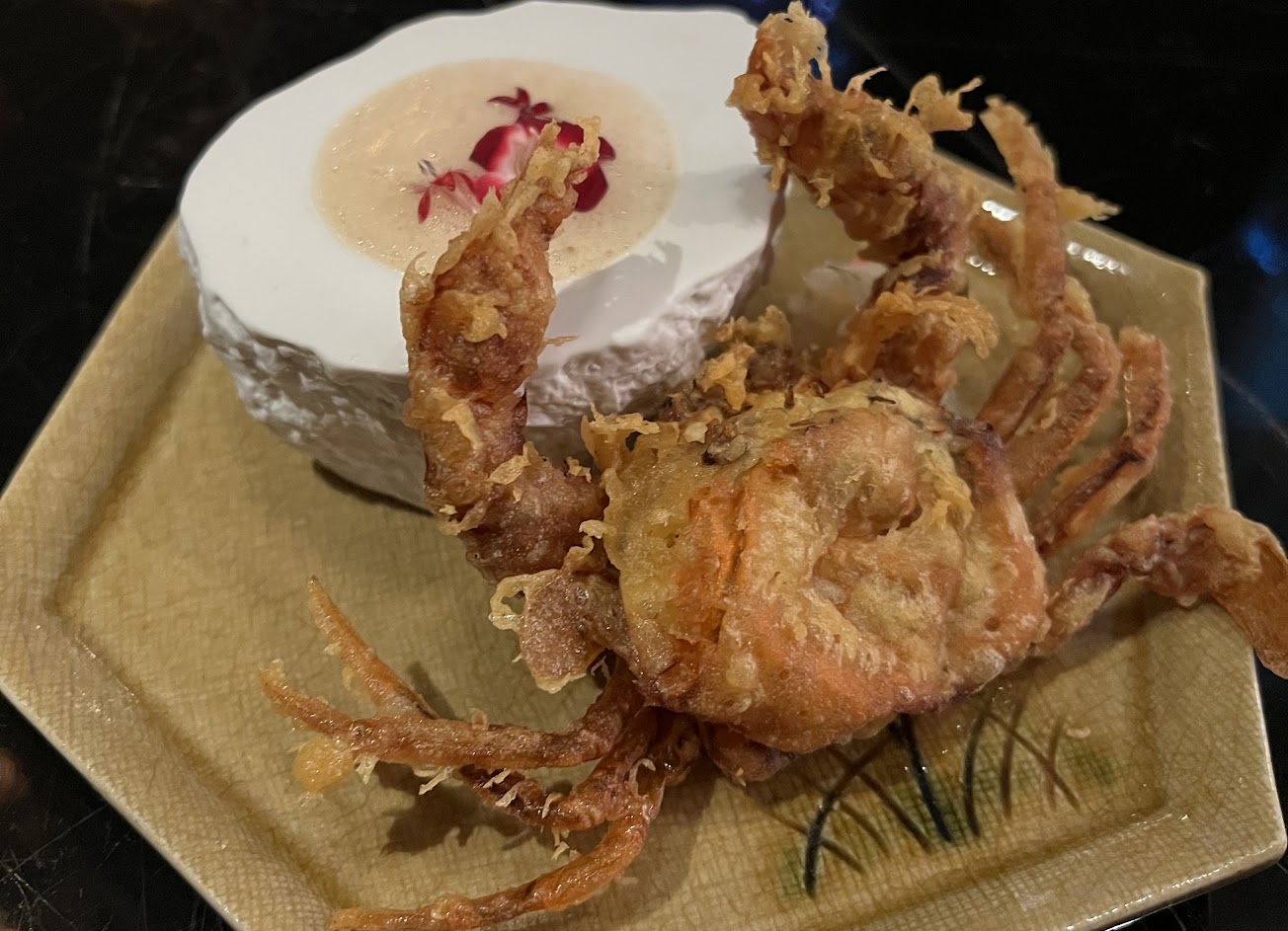 軟殼蟹新鮮也炸的夠酥,但太過小隻。鴨胸口感吃起來很不新鮮,說是以舒肥手法,但也沒有到嫩,甚至平均一半以上有筋。鮭魚親子飯香氣非常濃郁,米粒煮的渾圓飽滿且有光澤,鮭魚卵給的十分大方,但飯量可能需要再增加才不會導致整體過鹹。莓果酒粕冰淇淋是一道完全不知所以的甜點,點了火後既沒有華麗感,甚至加速冰淇淋融化速度,且讓莓果呈現苦澀味。