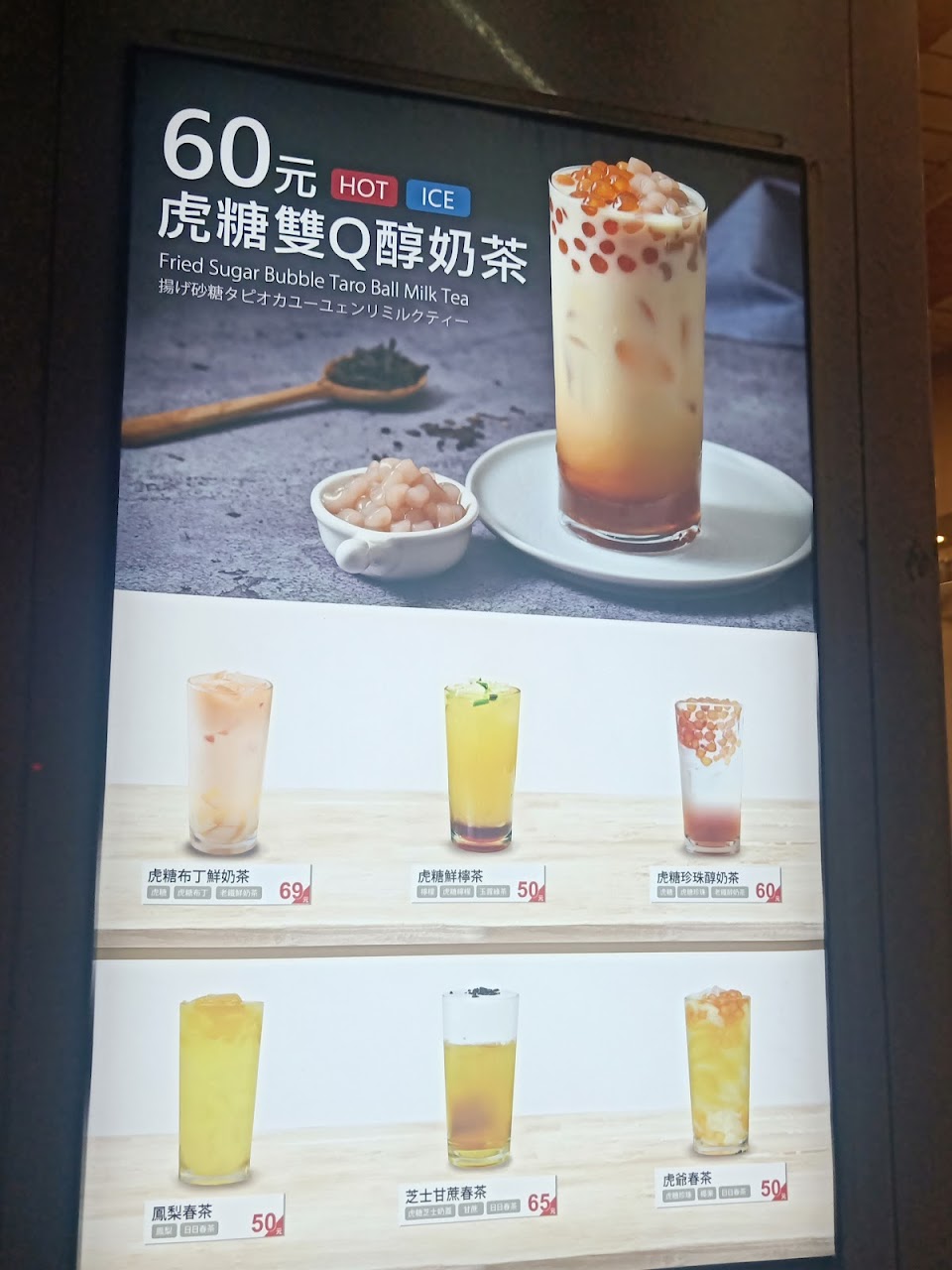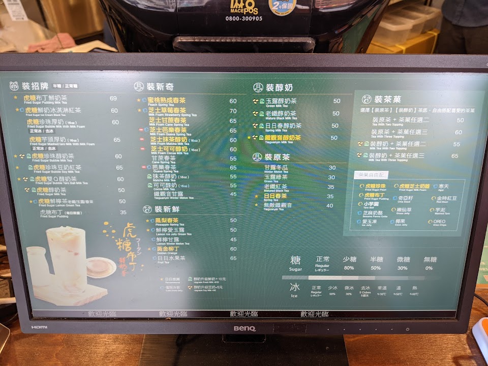 而位置剛好在馬路的中間轉角處,及其顯眼又好認,當中覺得最特別的就是店員介紹的虎糖,一開始其實看到菜單有點不清楚這是什麼,直到店員詳細說明後才知道…原來所謂的《虎糖》就是他們自己現炒的二砂糖,跟我們一般所知道的「黑糖」是完全不同的東西,而二砂糖炒出來的味道帶有一點點的焦香味,真的太特別了~~