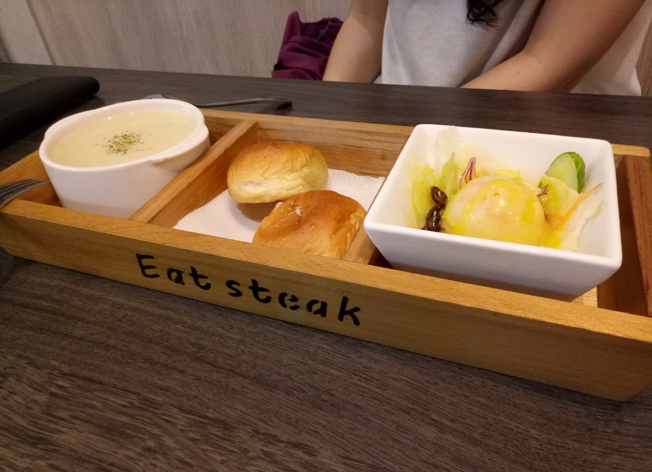 沒有牛排麵,而是牛排飯!超特別的!前菜濃湯+雙口味餐包+生菜沙拉,光前菜就稍稍飽了,肉的方面我沒有研究,就不評語了