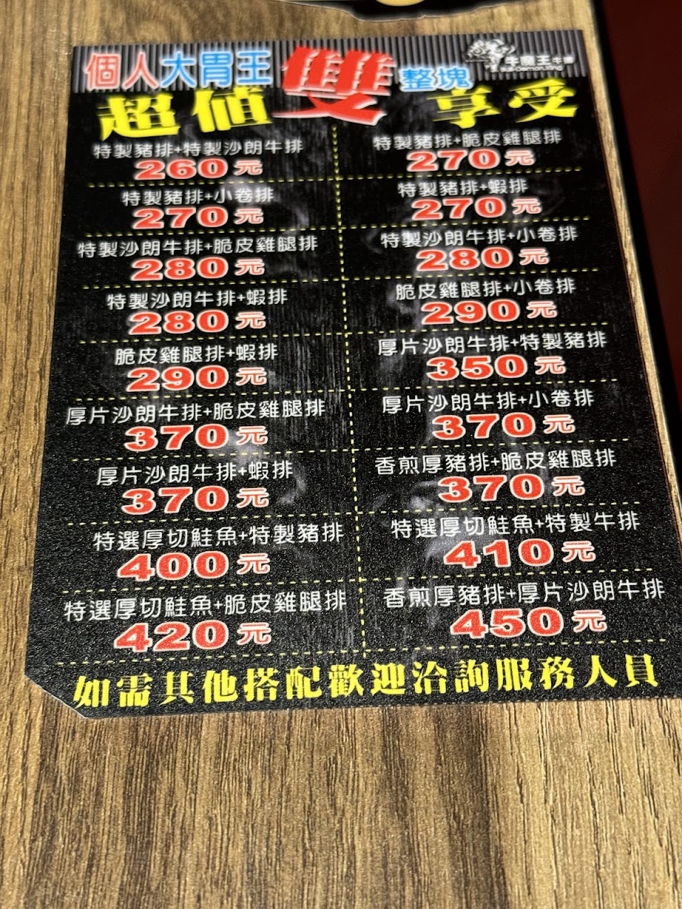 初次至牛魔王光華店用餐,服務團隊是一群熱情的年輕人,有鑒於平價又實惠的選擇,所以學生客群居多,用餐時會感覺特別熱鬧,內用排餐還附贈酥皮濃湯喲,哇塞,一上桌是整個奶香濃郁,濃湯也是不含糊,真想多喝幾碗,今天點了雙拼,本以為肉是切一半半的,結果是整塊肉品給你,還另外用盤子裝一塊,是不是非常大氣阿!總結來說,排餐水準不錯,份量也足夠,但醬汁少了點,一上桌麵條如不趕緊翻炒,很快就燒焦味出現了,超影響用餐心情,冰涼的紅茶任你喝,甜度適中,餐具需自取,化妝室在二樓樓梯旁,是個值得再訪的店家,推薦給大家前來享用!