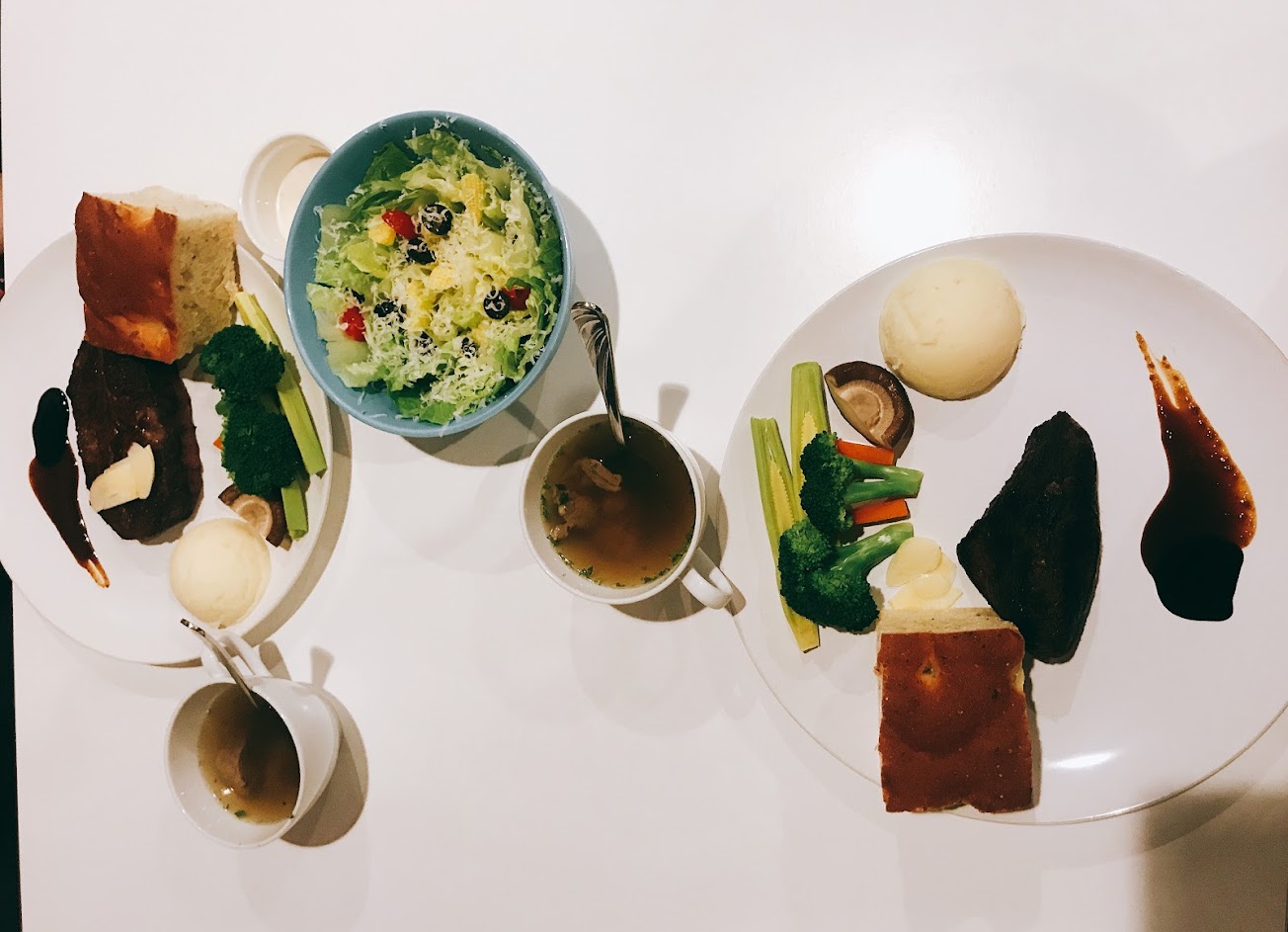 主餐都有附牛肉湯(不吃牛的人要事先告知不要湯),牛排建議是5分熟,需要熟一點也提早告知(不然只好先看別人吃)。