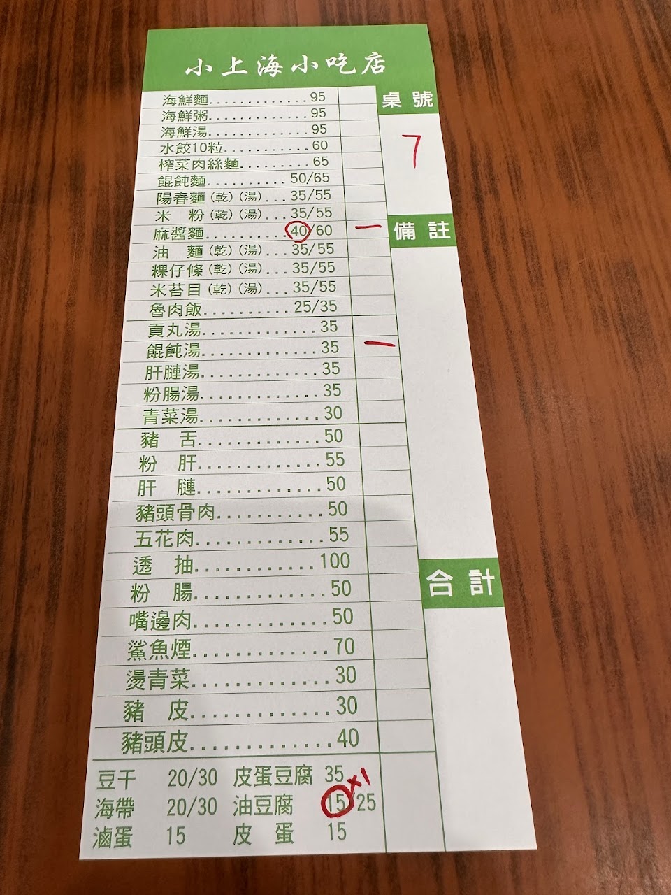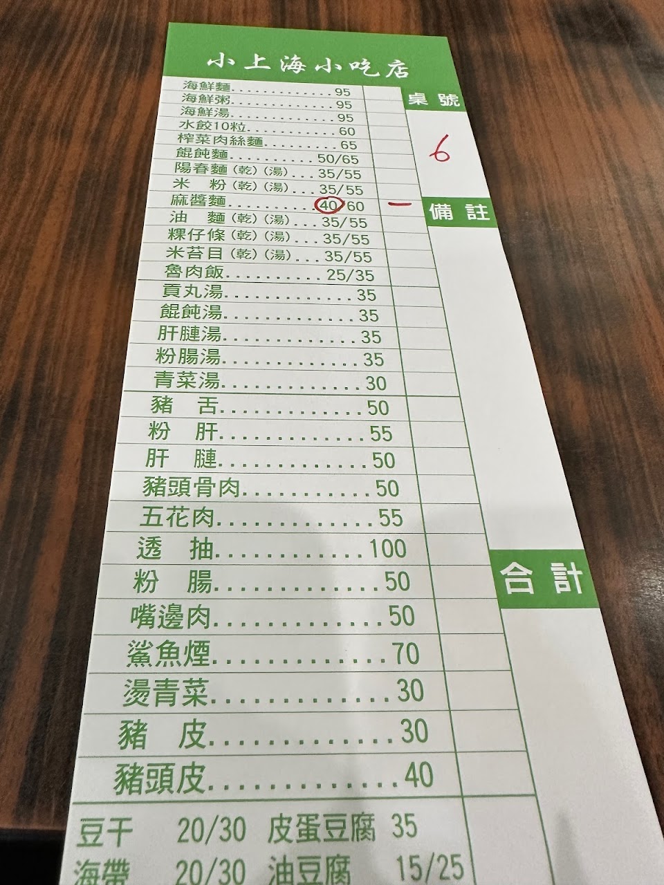 大麻醬細麵 粉腸湯 嘴邊肉 麻醬麵 餛飩湯 豬頭皮 豆腐魯 肉骨湯50元隱藏版品項菜單沒有 麻醬麵 油豆腐 豆干海帶 豬頭皮 油豆腐 麻醬麵 豆干海帶小菜 燙青菜 三層肉 大碗麻醬麵 粉肝