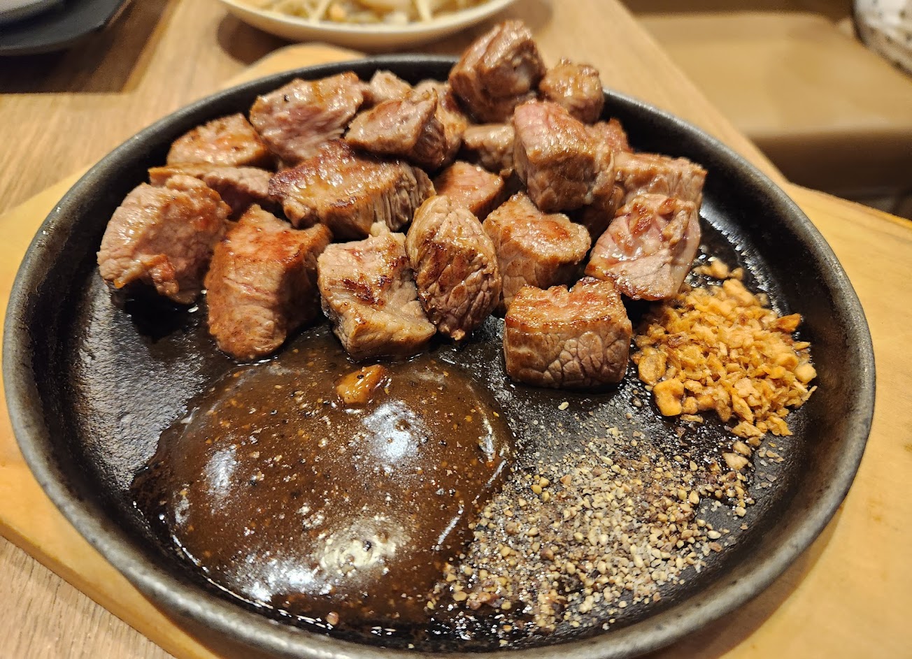 餐點部分,我選了原塊牛排激量版,較普通版高了90NTD,但份量可多了將近一份(也就是約兩倍的份量)。店員在點餐時已貼心的提醒可能會有些許筋膜,但整體口感並不會太難嚼,且每一口牛肉的味道都相當充足,也有不少汁水,個人還是蠻推薦的。