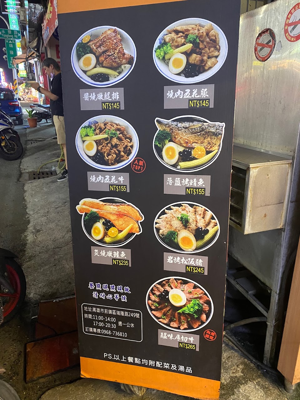 整體而言很不錯,牛肉份量十足,白飯也沒有讓我失望,調味得宜。附贈湯品普通,溏心蛋無法詮釋自己的名字。炸物都很酥脆,每盤都有相對應的沾醬。唯因店裡僅3名夥伴,送餐速度稍嫌緩慢。