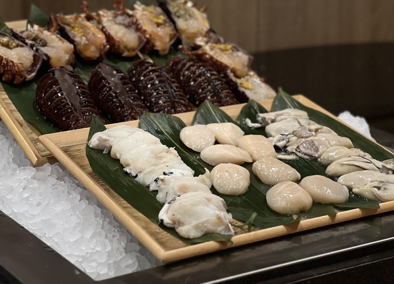 餐點的部份就頗具特色 可以吃到多樣的海鮮食材 入坐時就能夠看到板前有個秀餐區擺上當日要料理的新鮮食材 龍蝦3吃 真的很特別 也有干貝 廣島牡蠣 和牛堡及和牛可食用 料理的也非常美味 可惜份量都很小 很快的吃完 也很快的充滿空虛感