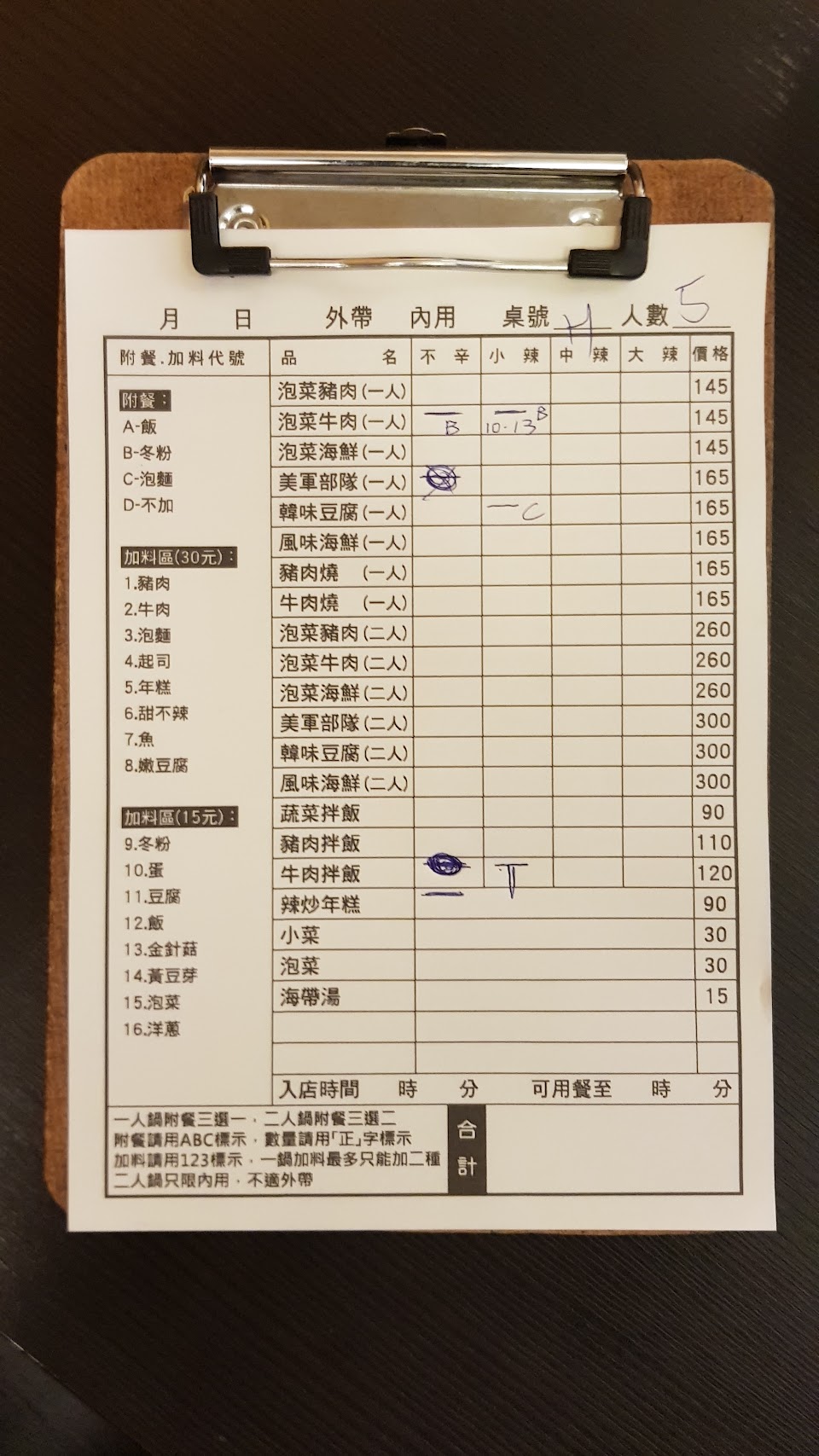 菜單每桌桌上皆有,畫單後到櫃檯點餐,餐後付款。店家只要以韓式鍋類、飯兩種類別為主。店家另提供4樣小菜一盤,有海帶絲、醃蘿蔔、豆芽菜、小黃瓜。