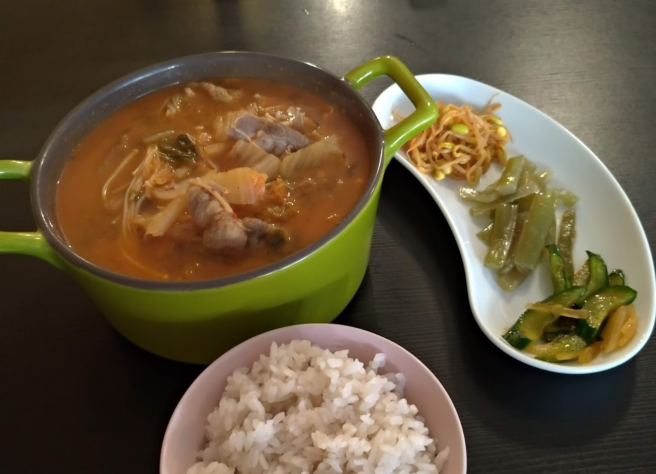 泡菜豬肉鍋的菜色種類少,但量滿多,菜色:金針菇,豬肉片,泡菜,豆腐,口感單調,豆腐是使用臭豆腐那種,個人比較喜歡配嫩豆腐??