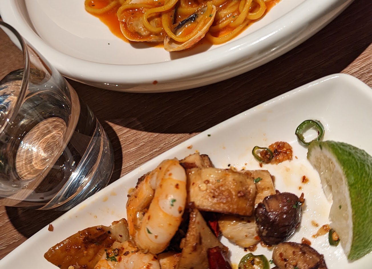 個人喜歡凱茵風香辣酥炸軟絲跟羅勒鮮蝦野菇起司麵。
