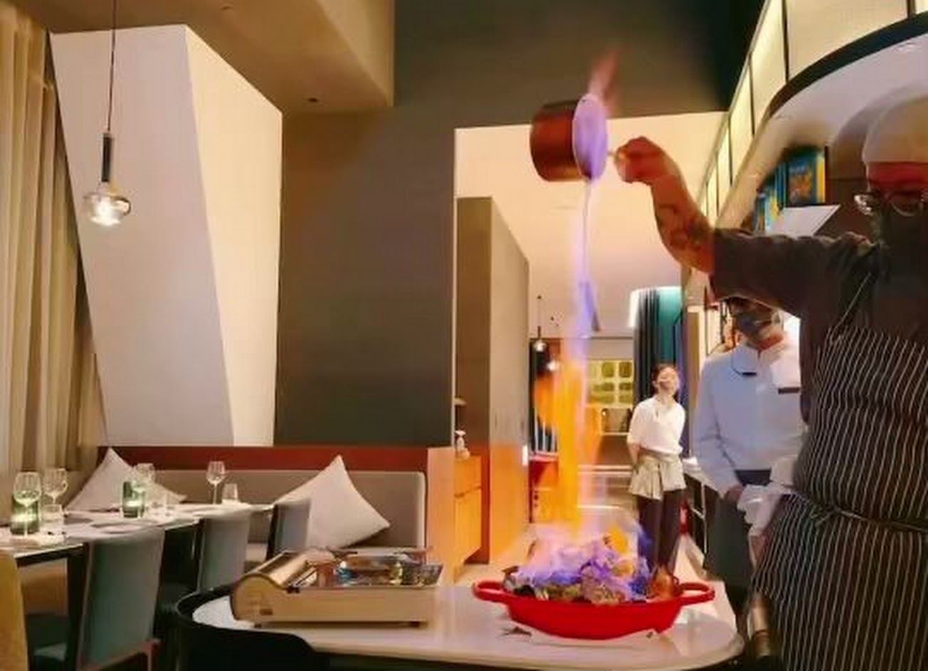 住房就在飯店吃晚餐了,有先訂白蘭地焰燒海鮮盤,雲林薩索雞胸,法國牛肝菌鳥巢麵,爐烤脆皮花椰菜盤,南瓜濃湯招待的。