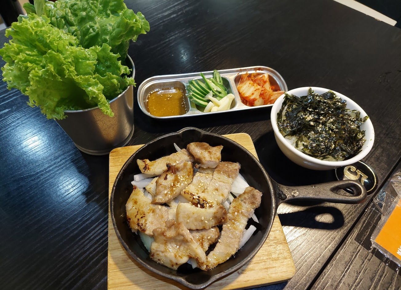另外還有點生菜包烤五花肉,已經烤好的五花肉搭配生菜,還可以加上海苔飯一起吃,有多種的吃法,有時候想吃個簡單的烤肉,也是很方便