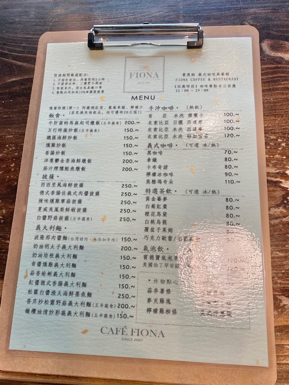 沒有華麗裝潢,不走流行韓風咖啡店,但每次來Fiona總是感受很親切,環境很舒服自在,每次喝義式奶類咖啡,總有拉花小驚喜,不僅咖啡好喝,餐點更是CP值超高,義大利麵、pizza、炸物跟甜點,都非常用心
