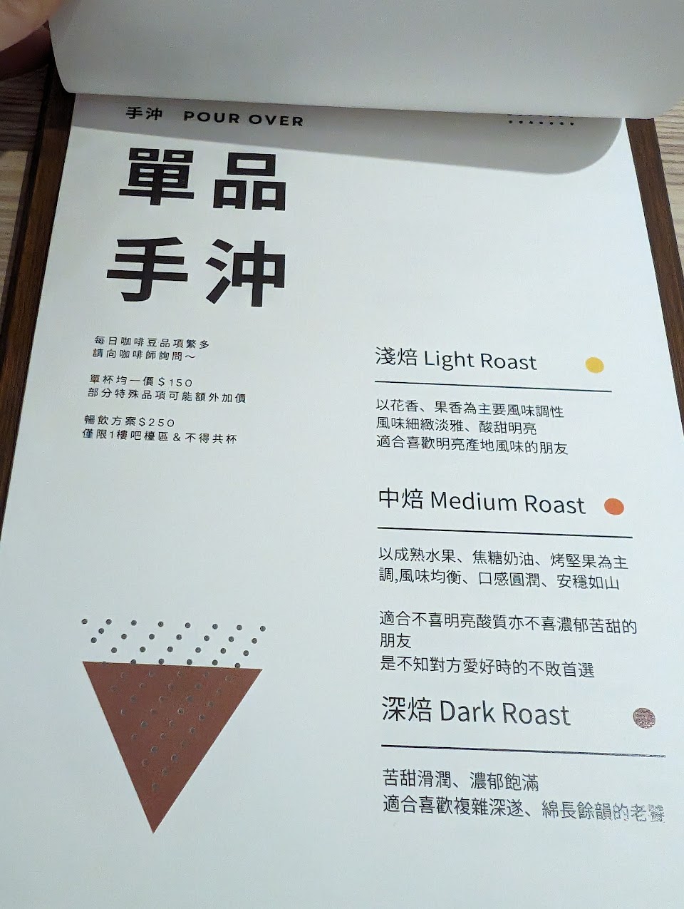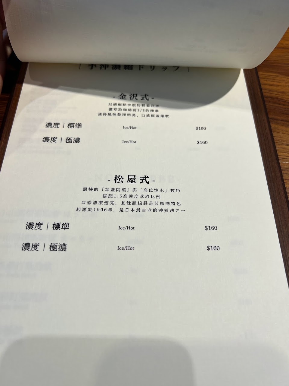賣的餐點以咖啡為主,還有一些咖啡調飲、氣泡飲料、茶類及甜點,最特別的是「松屋式」、「金沢式」沖煮法,雖然也很想試試看咖啡調飲,但這源自日本的古法實在太少見了,所以便點了金沢式咖啡(自己挑選豆子)。