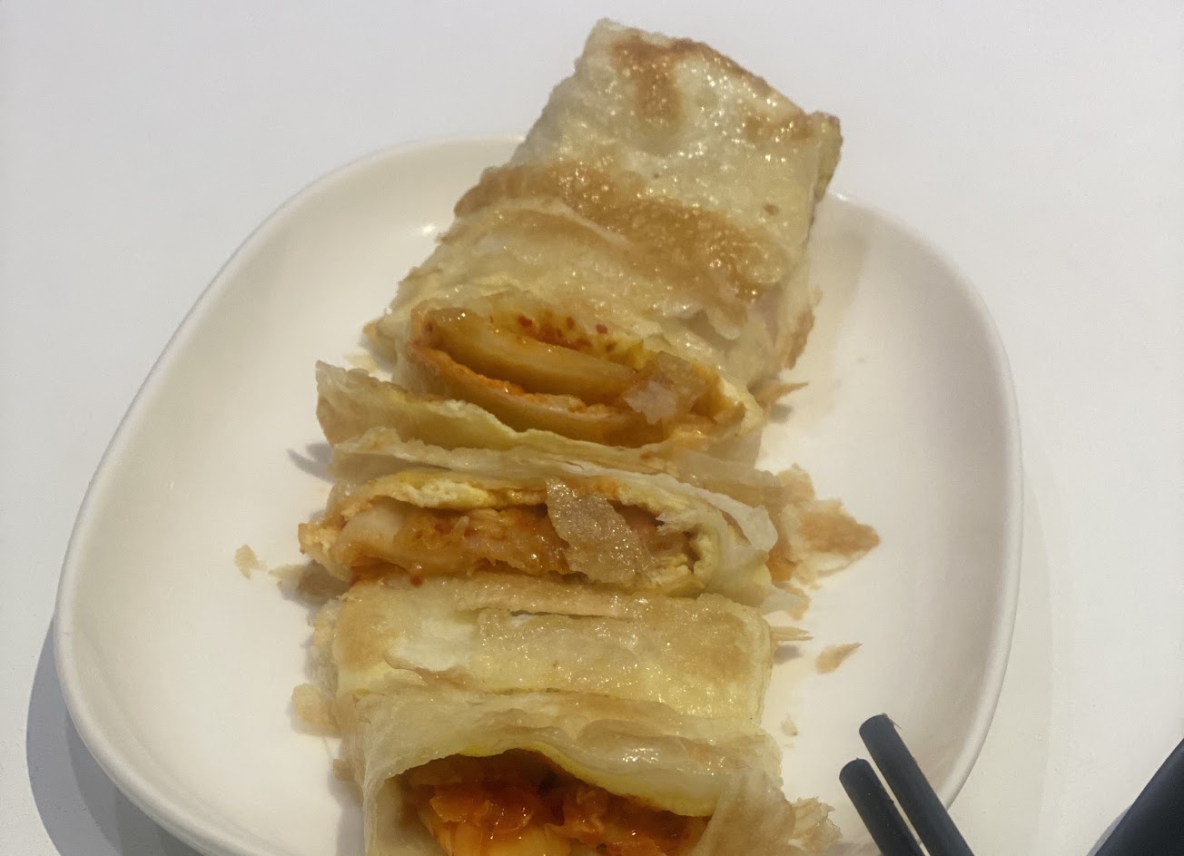 蛋餅餅皮是半煎炸、脆脆的,吃起來偏油膩