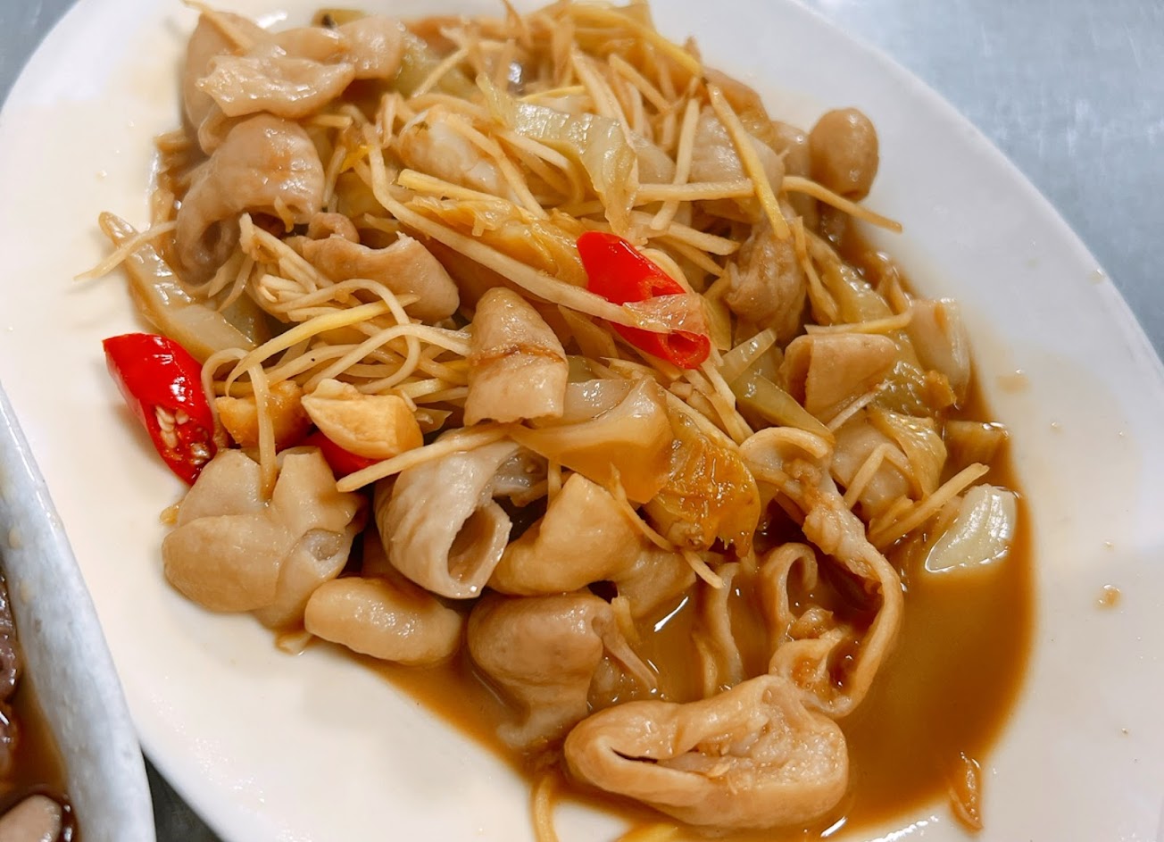 高雄的在地人宵夜 點了薑絲大腸、腿庫飯、煎魚肚。