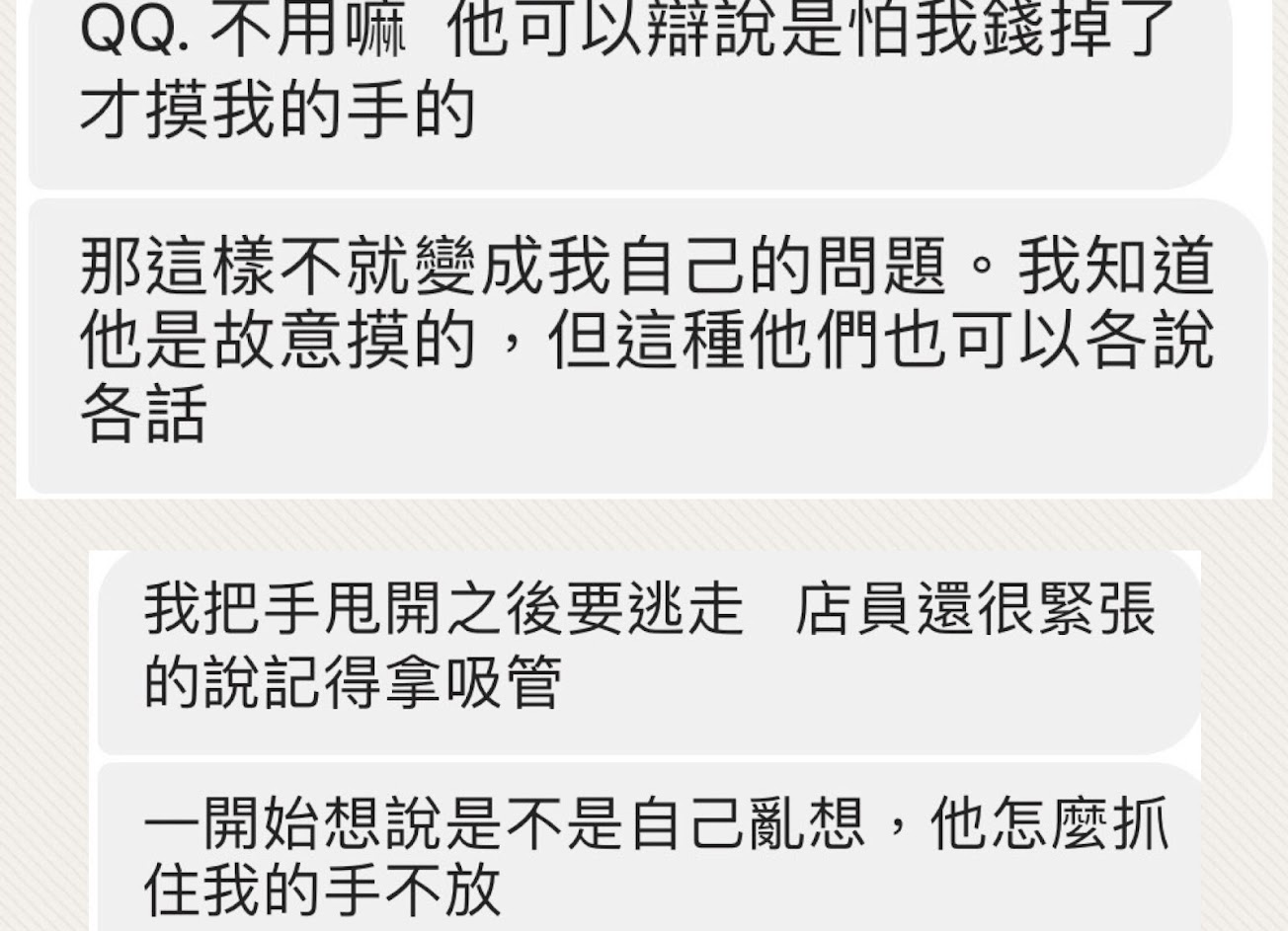 女朋友說覺得店家找錢時有刻意摸手,雖然可能是特定員工的個人行為,這種事也很難舉證,還是請女性朋友小心。