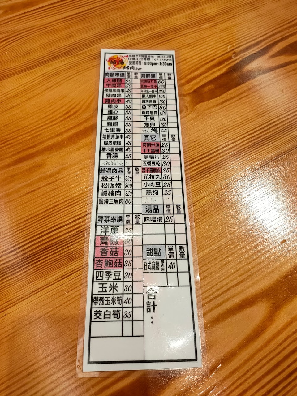 青年路靠民權路這一段有多家風評不錯的燒烤店,明知道不訂位吃不到的風險很大,但是劣根性就是心存僥倖。在民權路停好車,往第一目標前進,不意外的槓龜。第二間也沒位置,但時間湊巧,訂位的人no show,剛好就補上這個騎樓下兩張矮凳子和50公分見方的小桌子,瞬時覺得自己就是老天眷顧的幸運兒。食物的調味和熟度都拿捏得很好,特別有印象值得一提的,烤洋蔥可口多汁;秋刀魚對剖烤得酥脆,連魚頭都可咬碎吞下;米血軟硬適中;烤虱目魚現較少見,吃懷念的;明太子山藥也很適口。比較可惜的是,最大一盤食物上桌時,因為食物不是一串串,份量少,體積又小,在盤子裡混在一起,我只能認出玉米。在昏暗的燈光下,牛肉、雞皮、雞屁股是分不清楚的,吃進嘴裡要再思考一下,才能勉強確定,就算吃廉價版的分子料理吧。