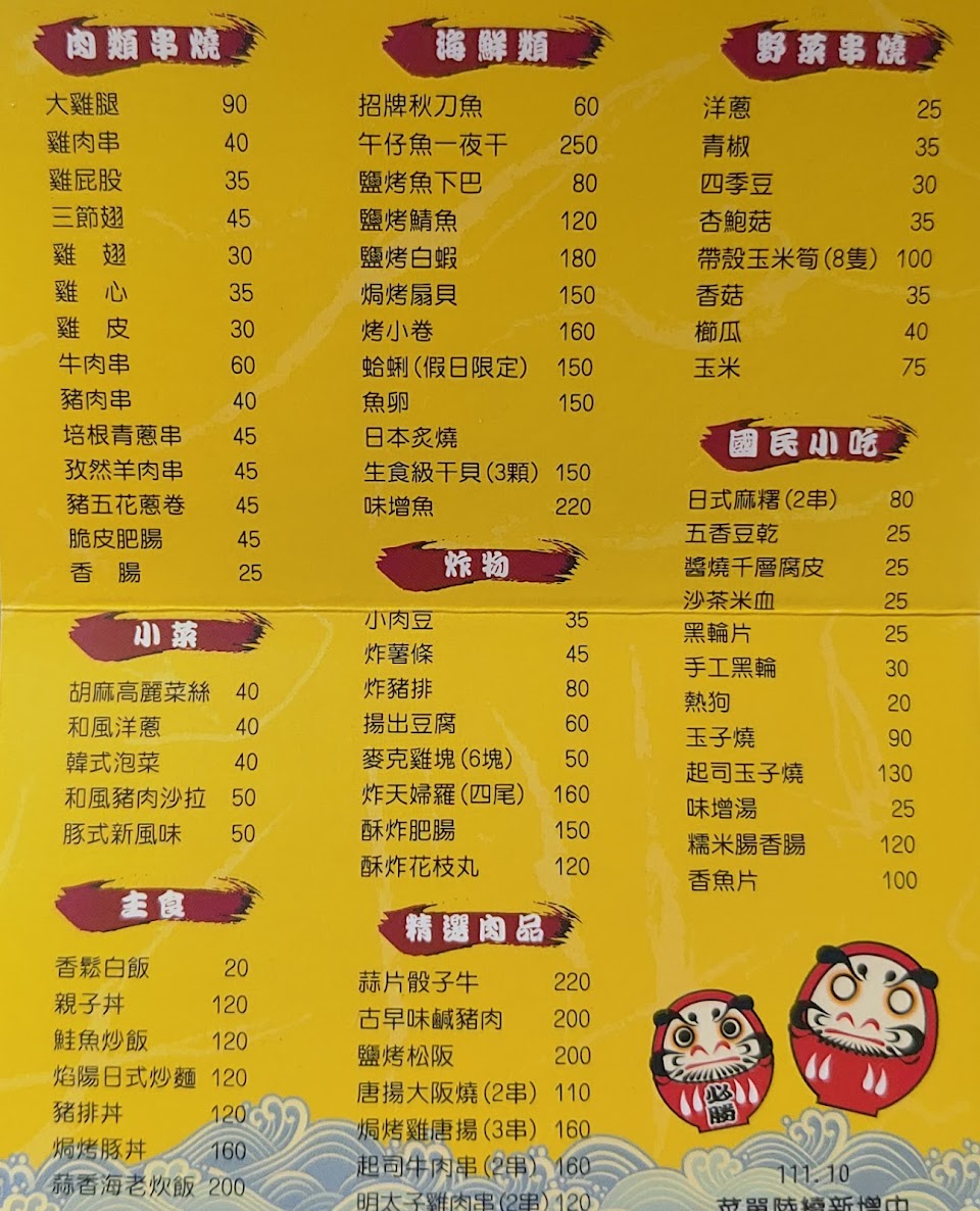 玉子燒, 揚出豆腐, 生啤 鯖魚 烤雞腿等多樣燒烤, 烤米血必點, 烤黑輪 沙茶米血 烤牛肉, 明太子雞