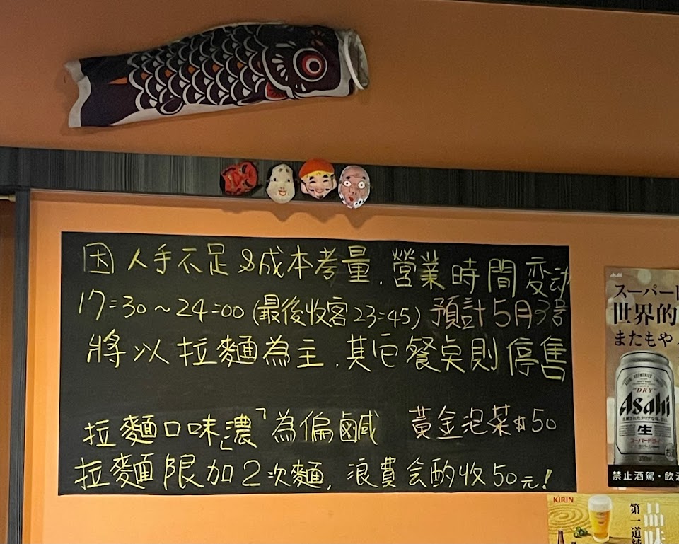 拉麵味道較偏日式,口味較重,不過超好吃,不容易膩,其他小菜也不錯,價格中等,大多在150左右,但美味的程度真的不會輸兩、三百塊的高檔店,不過店面狹小,有些擠,背包過大的去之前要注意一下,因為會擋到路