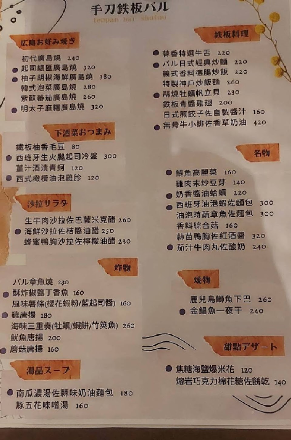 菜單的主食大致分為廣島燒及鐵板料理(炒飯、炒麵等等)