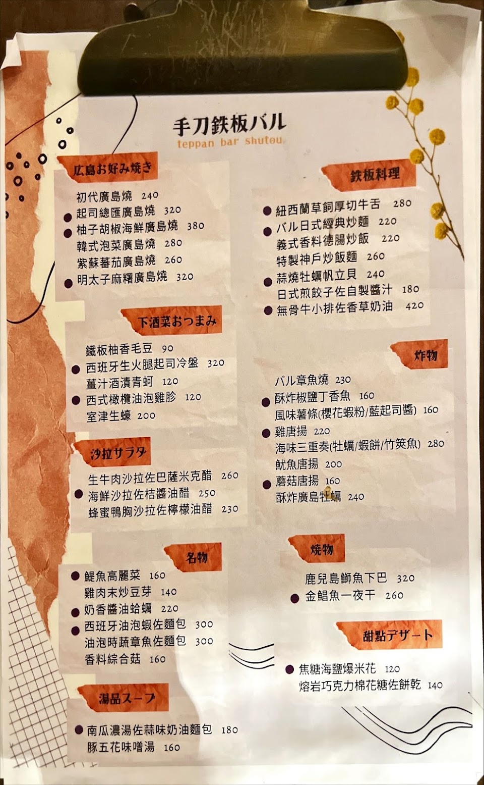 海鮮廣島燒用料超實在,基底是滿滿青菜外上面有大明蝦.扇貝.魷魚.牡蠣,調味不會很重口味讓人感到死鹹或膩口,可以自己淋日式美乃滋跟大阪燒醬調整自己口味(小可惜柚子鹽的味道比較沒有那麼明顯 – 質地超細緻香濃但清爽的南瓜濃湯,有淡淡南瓜香味又不會太重讓人害怕,搭配有蒜香的麵包(但後來麵包被拿去配超好吃的油泡蝦了?,湯可以自己獨立 – 蒜香牛舌有點小可惜,會覺得比較熟一點口感會比較有韌性一點,但蔥鹽很好吃香氣很夠,而且擠檸檬的工具很酷炫,不沾手?? – 超級好吃西班牙油泡蝦❤️❤️ 用旁邊的麵包沾跟放上蝦子吃,第一口就超驚豔!蝦油的香氣炸裂然後蒜的味道也很充足然後有一些淡淡辣椒香不辣就是香香的,但他比較鹹一些配麵包剛剛好,而且麵包可以大吸蝦油好好吃(後來吃不夠把湯的麵包拿來配著吃,希望以後可以再加購麵包 – 整體用餐體驗很不錯 覺得得推但又怕太多人以後吃不到~ 下次要試看看隔壁的手刀串燒,手刀鐵板的等級讓人也很期待串燒的表現~ 服務 內用 餐點類型 晚餐 平均每人消費金額 $400-600