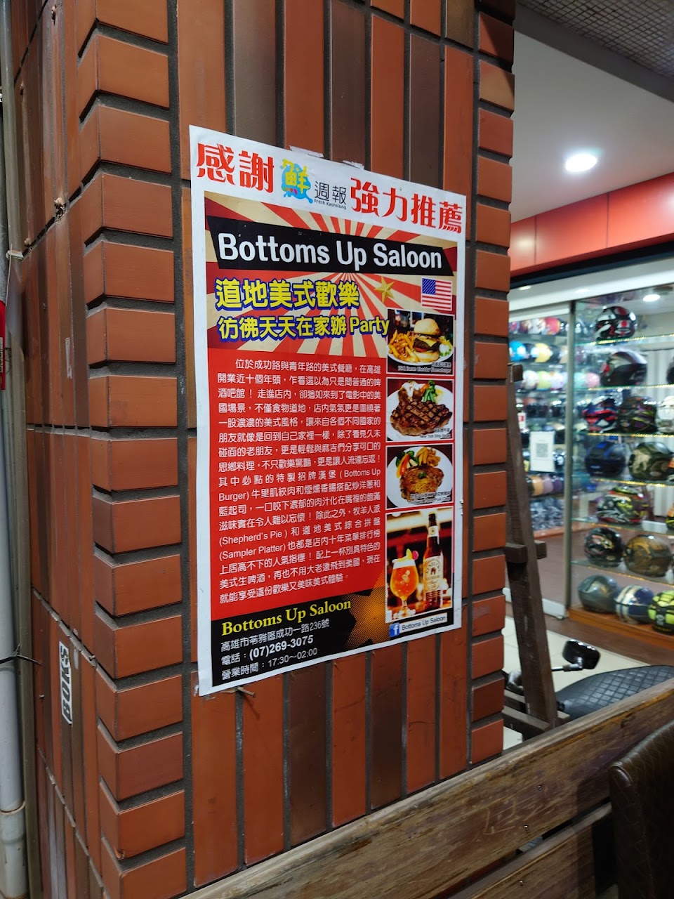 高雄市漢神百貨附近成功路上近青年路路口的「Bottoms Up Saloon」, 是一間走紐約雅痞風格的美式復古運動酒吧。 這家的美式和墨式小點都很好吃, 餐點選擇相當豐富, 很適合搭酒。 店裡有架設電視轉播運動賽事, 包括世界盃足球賽賽事也有轉播。 這家也是一間適合好友聚餐或下班小酌, 一邊用餐一邊觀賞球賽的好地方。