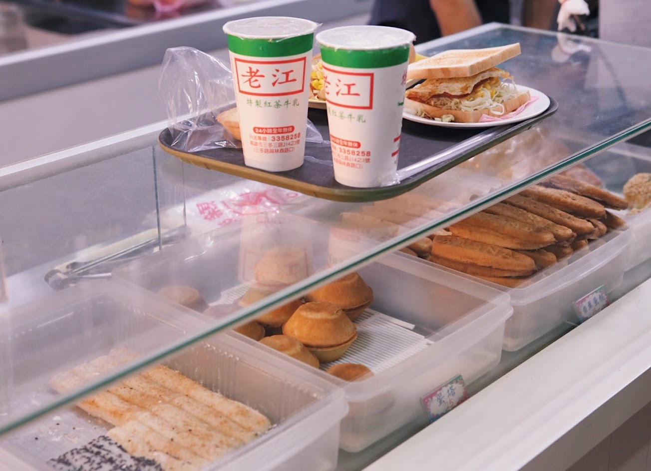 老江紅茶牛奶40元,火腿蛋土司要55元,蛋是半熟的,所以吃的時候會有蛋汁,個人覺得就普通,但很多學生在這吃