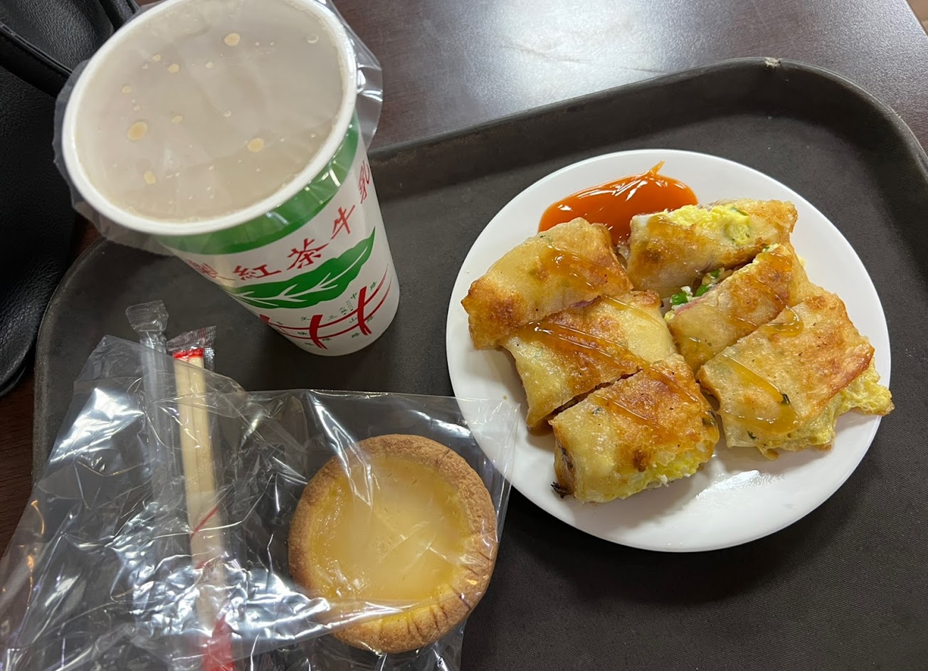 蛋餅的餅皮很酥脆,紅茶牛奶帶有一點咖啡味。